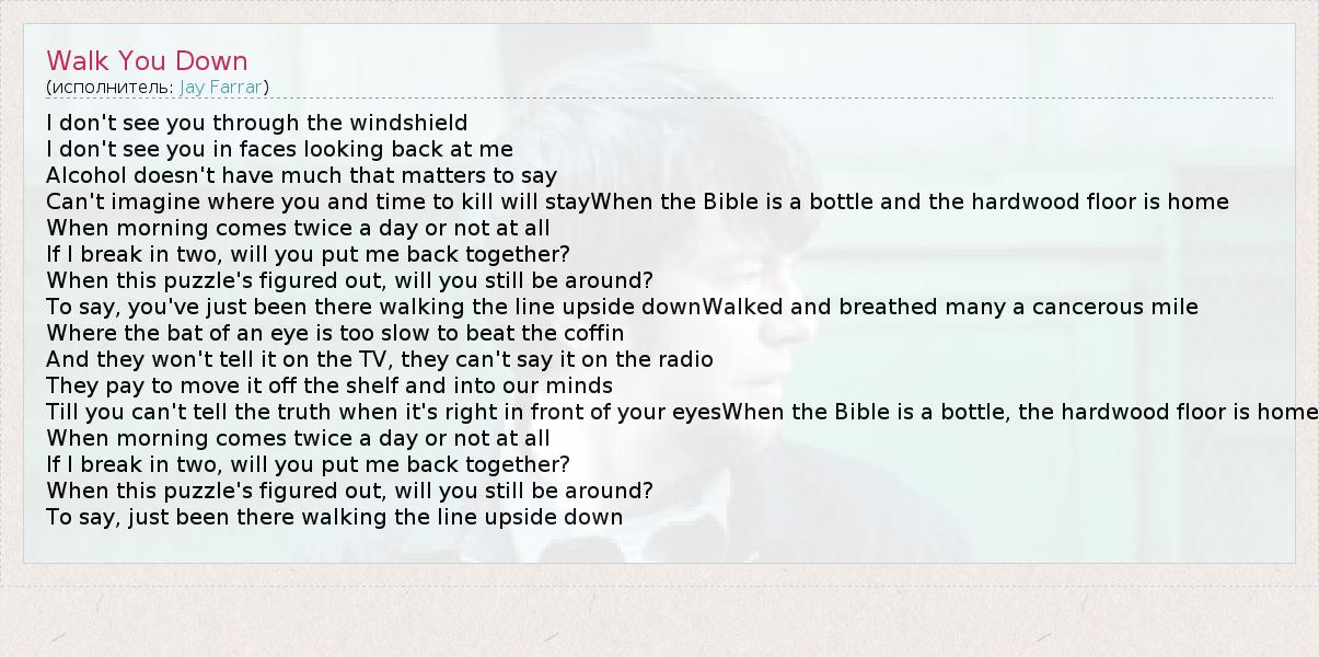 I don't see you through the windshield I don't see you in faces looking back at me Alcohol doesn't have much that matters to say Can't imagine where you and time to kill will stayWhen the Bible is a bottle and the hardwood floor is home When morning comes twice a day or not at all If I break in two, will you put me back together? When this puzzle's figured out, will you still be around? To say, you've just been there walking the line upside downWalked and breathed many a cancerous mile Where the bat of an eye is too slow to beat the coffin And they won't tell it on the TV, they can't say it on the radio They pay to move it off the shelf and into our minds Till you can't tell the truth when it's right in front of your eyesWhen the Bible is a bottle, the hardwood floor is home When morning comes twice a day or not at all If I break in two, will you put me back together? When this puzzle's figured out, will you still be around? To say, just been there walking the line upside down