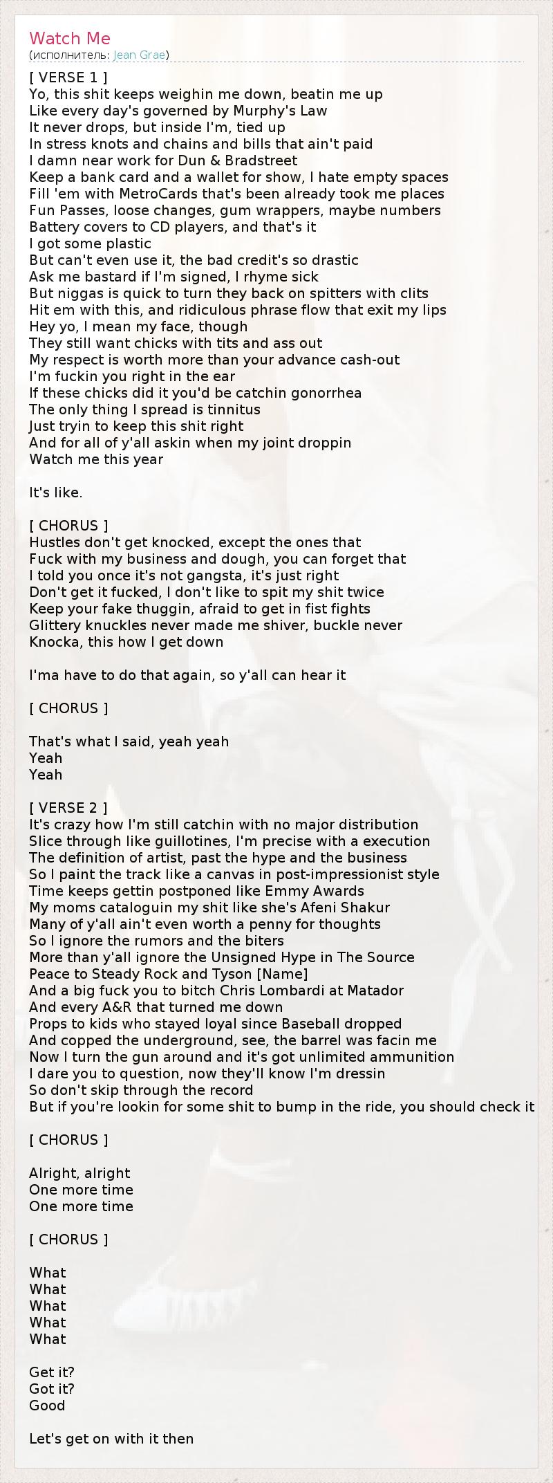 [ VERSE 1 ] Yo, this shit keeps weighin me down, beatin me up Like every day's governed by Murphy's Law It never drops, but inside I'm, tied up In stress knots and chains and bills that ain't paid I damn near work for Dun & Bradstreet Keep a bank card and a wallet for show, I hate empty spaces Fill 'em with MetroCards that's been already took me places Fun Passes, loose changes, gum wrappers, maybe numbers Battery covers to CD players, and that's it I got some plastic But can't even use it, the bad credit's so drastic Ask me bastard if I'm signed, I rhyme sick But niggas is quick to turn they back on spitters with clits Hit em with this, and ridiculous phrase flow that exit my lips Hey yo, I mean my face, though They still want chicks with tits and ass out My respect is worth more than your advance cash-out I'm fuckin you right in the ear If these chicks did it you'd be catchin gonorrhea The only thing I spread is tinnitus Just tryin to keep this shit right And for all of y'all askin when my joint droppin Watch me this year It's like. [ CHORUS ] Hustles don't get knocked, except the ones that Fuck with my business and dough, you can forget that I told you once it's not gangsta, it's just right Don't get it fucked, I don't like to spit my shit twice Keep your fake thuggin, afraid to get in fist fights Glittery knuckles never made me shiver, buckle never Knocka, this how I get down I'ma have to do that again, so y'all can hear it [ CHORUS ] That's what I said, yeah yeah Yeah Yeah [ VERSE 2 ] It's crazy how I'm still catchin with no major distribution Slice through like guillotines, I'm precise with a execution The definition of artist, past the hype and the business So I paint the track like a canvas in post-impressionist style Time keeps gettin postponed like Emmy Awards My moms cataloguin my shit like she's Afeni Shakur Many of y'all ain't even worth a penny for thoughts So I ignore the rumors and the biters More than y'all ignore the Unsigned Hype in The Source Peace to Steady Rock and Tyson [Name] And a big fuck you to bitch Chris Lombardi at Matador And every A&R that turned me down Props to kids who stayed loyal since Baseball dropped And copped the underground, see, the barrel was facin me Now I turn the gun around and it's got unlimited ammunition I dare you to question, now they'll know I'm dressin So don't skip through the record But if you're lookin for some shit to bump in the ride, you should check it [ CHORUS ] Alright, alright One more time One more time [ CHORUS ] What What What What What Get it? Got it? Good Let's get on with it then