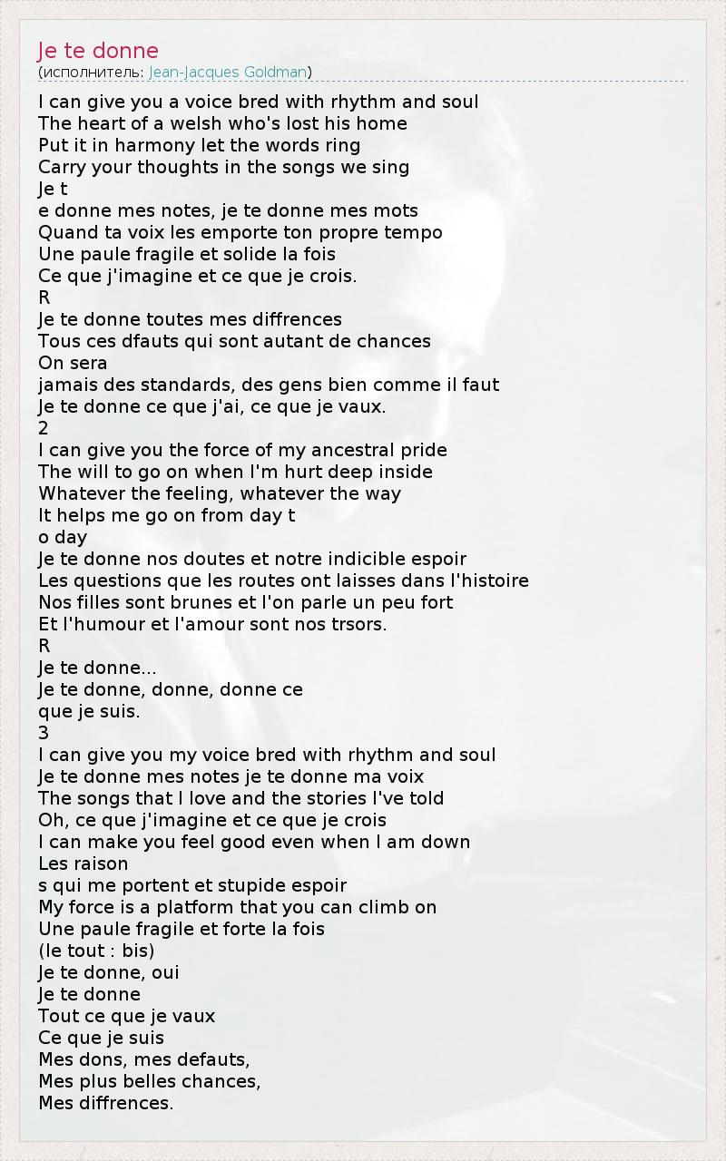 I can give you a voice bred with rhythm and soul The heart of a welsh who's lost his home Put it in harmony let the words ring Carry your thoughts in the songs we sing Je t e donne mes notes, je te donne mes mots Quand ta voix les emporte ton propre tempo Une paule fragile et solide la fois Ce que j'imagine et ce que je crois. R Je te donne toutes mes diffrences Tous ces dfauts qui sont autant de chances On sera jamais des standards, des gens bien comme il faut Je te donne ce que j'ai, ce que je vaux. 2 I can give you the force of my ancestral pride The will to go on when I'm hurt deep inside Whatever the feeling, whatever the way It helps me go on from day t o day Je te donne nos doutes et notre indicible espoir Les questions que les routes ont laisses dans l'histoire Nos filles sont brunes et l'on parle un peu fort Et l'humour et l'amour sont nos trsors. R Je te donne... Je te donne, donne, donne ce que je suis. 3 I can give you my voice bred with rhythm and soul Je te donne mes notes je te donne ma voix The songs that I love and the stories I've told Oh, ce que j'imagine et ce que je crois I can make you feel good even when I am down Les raison s qui me portent et stupide espoir My force is a platform that you can climb on Une paule fragile et forte la fois (le tout : bis) Je te donne, oui Je te donne Tout ce que je vaux Ce que je suis Mes dons, mes defauts, Mes plus belles chances, Mes diffrences.