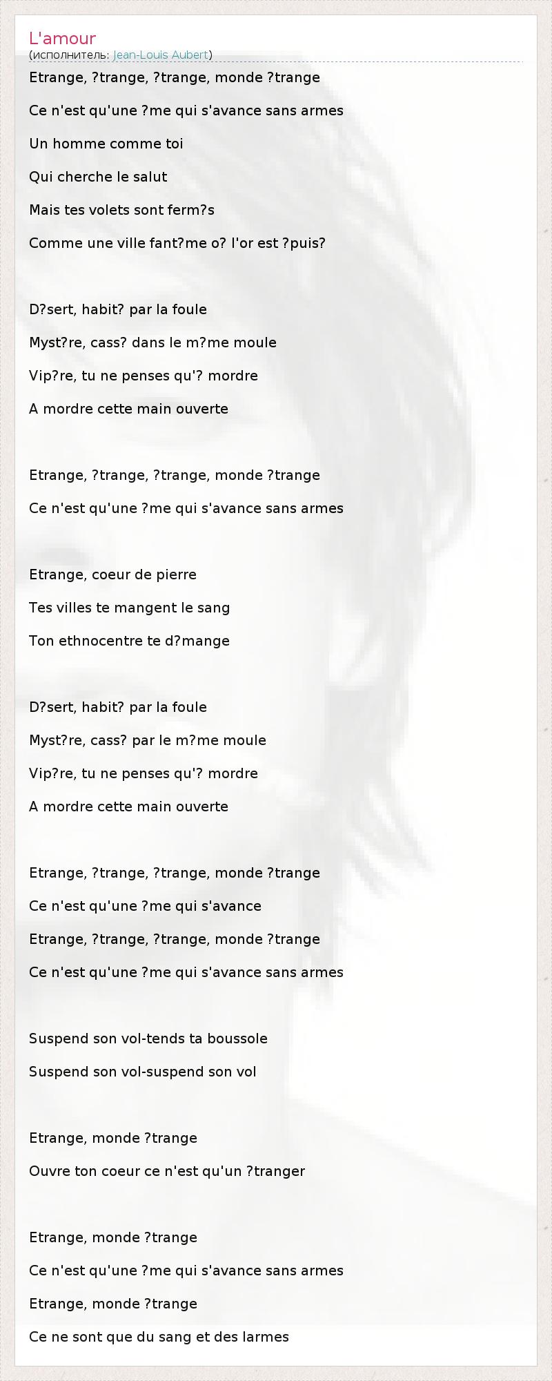 Etrange, ?trange, ?trange, monde ?trange Ce n'est qu'une ?me qui s'avance sans armes Un homme comme toi Qui cherche le salut Mais tes volets sont ferm?s Comme une ville fant?me o? l'or est ?puis? D?sert, habit? par la foule Myst?re, cass? dans le m?me moule Vip?re, tu ne penses qu'? mordre A mordre cette main ouverte Etrange, ?trange, ?trange, monde ?trange Ce n'est qu'une ?me qui s'avance sans armes Etrange, coeur de pierre Tes villes te mangent le sang Ton ethnocentre te d?mange D?sert, habit? par la foule Myst?re, cass? par le m?me moule Vip?re, tu ne penses qu'? mordre A mordre cette main ouverte Etrange, ?trange, ?trange, monde ?trange Ce n'est qu'une ?me qui s'avance Etrange, ?trange, ?trange, monde ?trange Ce n'est qu'une ?me qui s'avance sans armes Suspend son vol-tends ta boussole Suspend son vol-suspend son vol Etrange, monde ?trange Ouvre ton coeur ce n'est qu'un ?tranger Etrange, monde ?trange Ce n'est qu'une ?me qui s'avance sans armes Etrange, monde ?trange Ce ne sont que du sang et des larmes