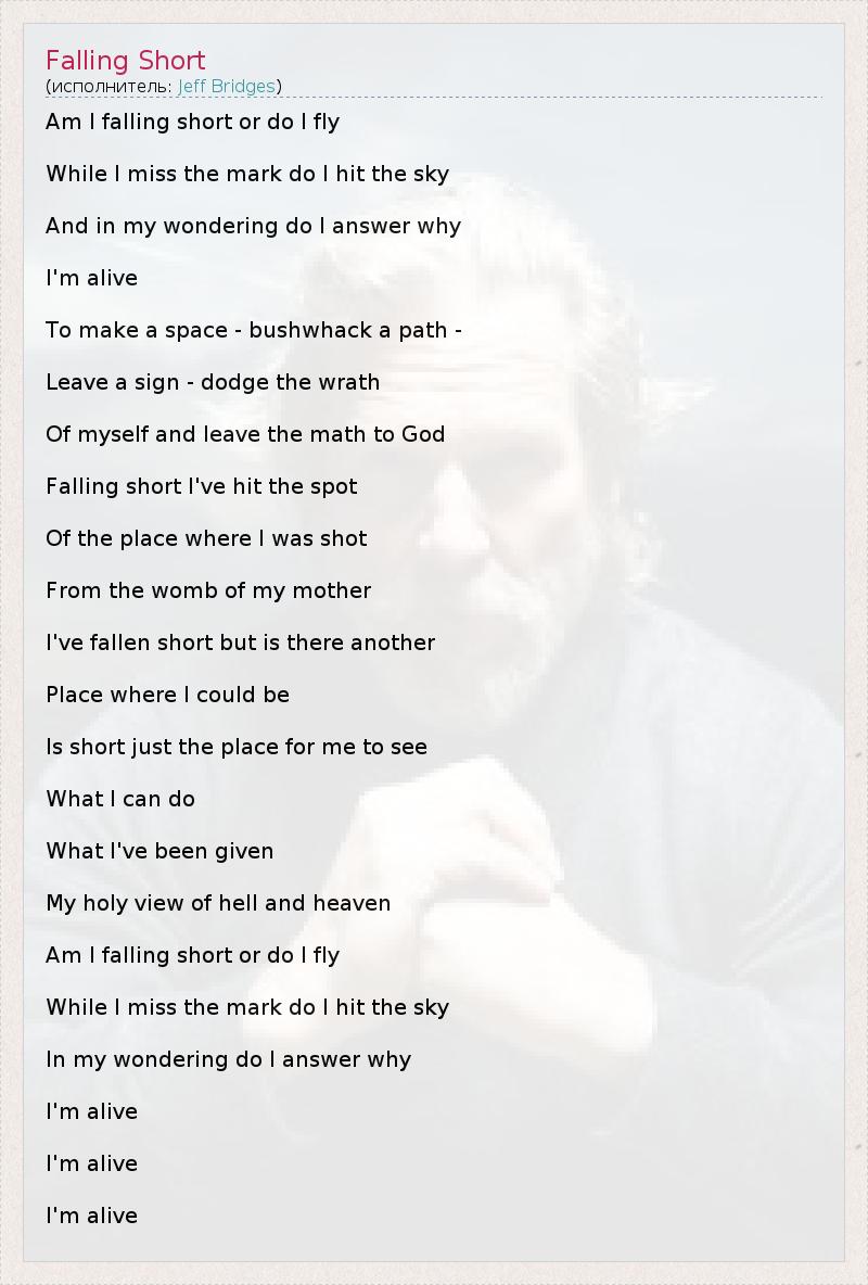 Am I falling short or do I fly While I miss the mark do I hit the sky And in my wondering do I answer why I'm alive To make a space - bushwhack a path - Leave a sign - dodge the wrath Of myself and leave the math to God Falling short I've hit the spot Of the place where I was shot From the womb of my mother I've fallen short but is there another Place where I could be Is short just the place for me to see What I can do What I've been given My holy view of hell and heaven Am I falling short or do I fly While I miss the mark do I hit the sky In my wondering do I answer why I'm alive I'm alive I'm alive