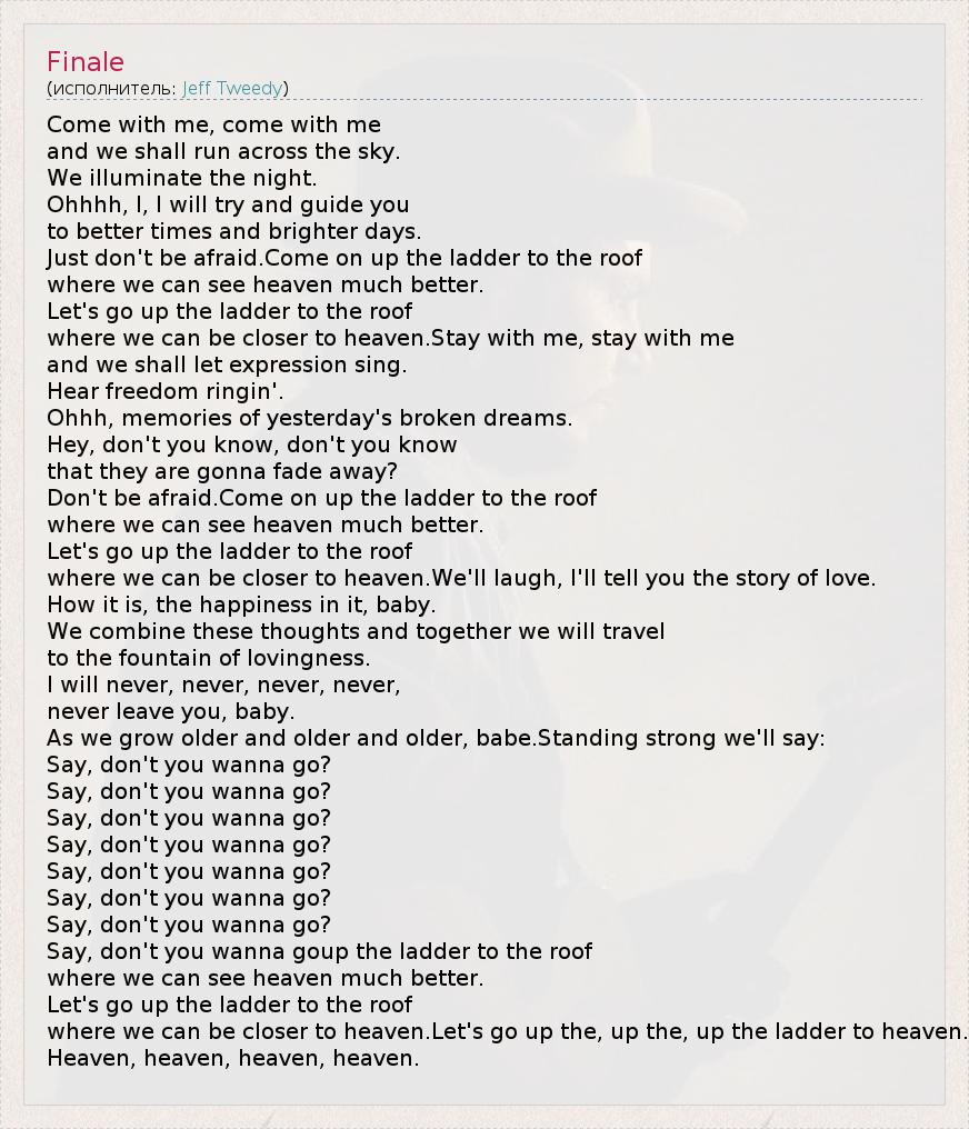 Come with me, come with me and we shall run across the sky. We illuminate the night. Ohhhh, I, I will try and guide you to better times and brighter days. Just don't be afraid.Come on up the ladder to the roof where we can see heaven much better. Let's go up the ladder to the roof where we can be closer to heaven.Stay with me, stay with me and we shall let expression sing. Hear freedom ringin'. Ohhh, memories of yesterday's broken dreams. Hey, don't you know, don't you know that they are gonna fade away? Don't be afraid.Come on up the ladder to the roof where we can see heaven much better. Let's go up the ladder to the roof where we can be closer to heaven.We'll laugh, I'll tell you the story of love. How it is, the happiness in it, baby. We combine these thoughts and together we will travel to the fountain of lovingness. I will never, never, never, never, never leave you, baby. As we grow older and older and older, babe.Standing strong we'll say: Say, don't you wanna go? Say, don't you wanna go? Say, don't you wanna go? Say, don't you wanna go? Say, don't you wanna go? Say, don't you wanna go? Say, don't you wanna go? Say, don't you wanna goup the ladder to the roof where we can see heaven much better. Let's go up the ladder to the roof where we can be closer to heaven.Let's go up the, up the, up the ladder to heaven. Heaven, heaven, heaven, heaven.