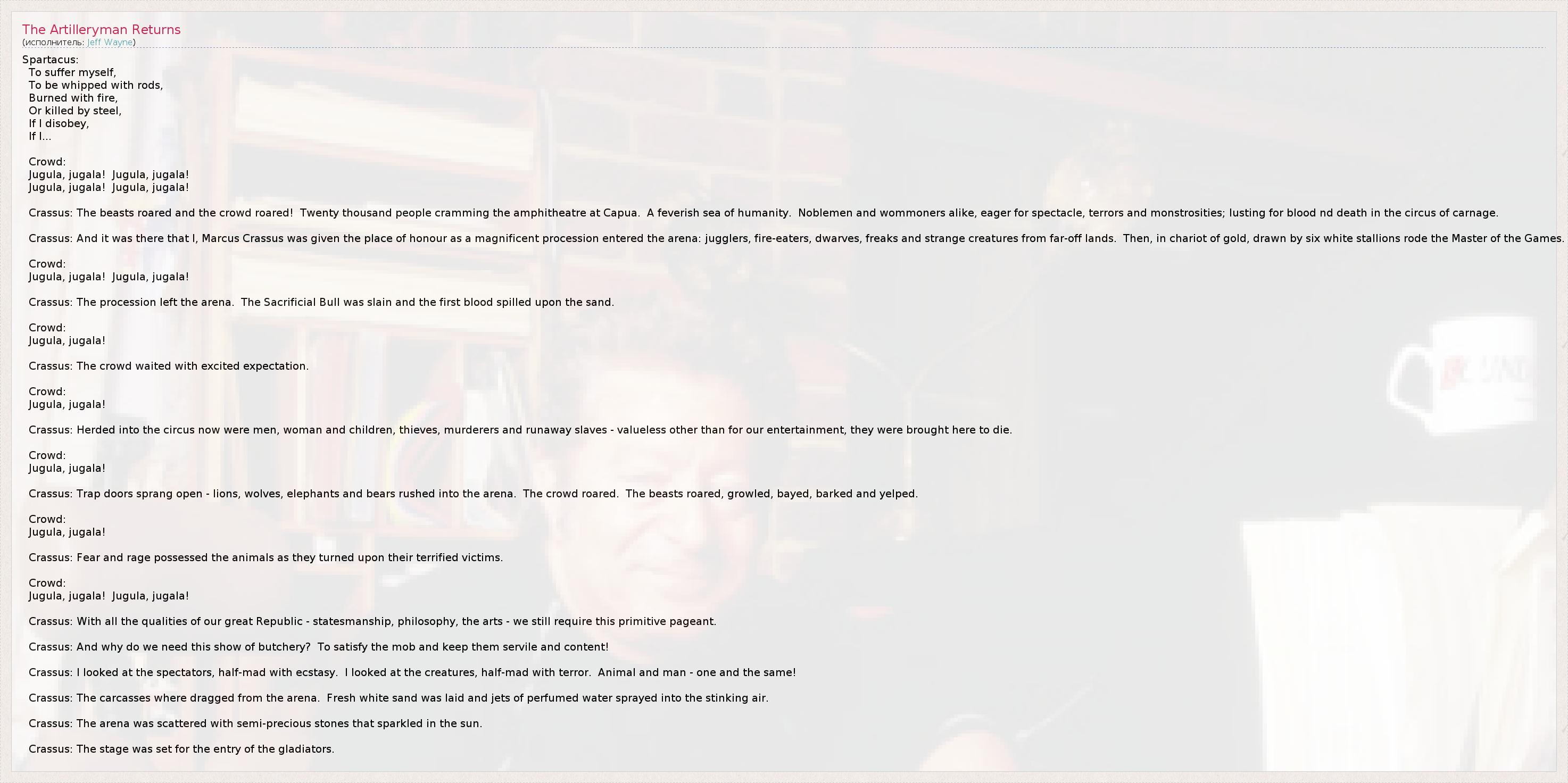 Crassus: And it was there that I, Marcus Crassus was given the place of honour as a magnificent procession entered the arena: jugglers, fire-eaters, dwarves, freaks and strange creatures from far-off lands.  Then, in chariot of gold, drawn by six white stallions rode the Master of the Games.