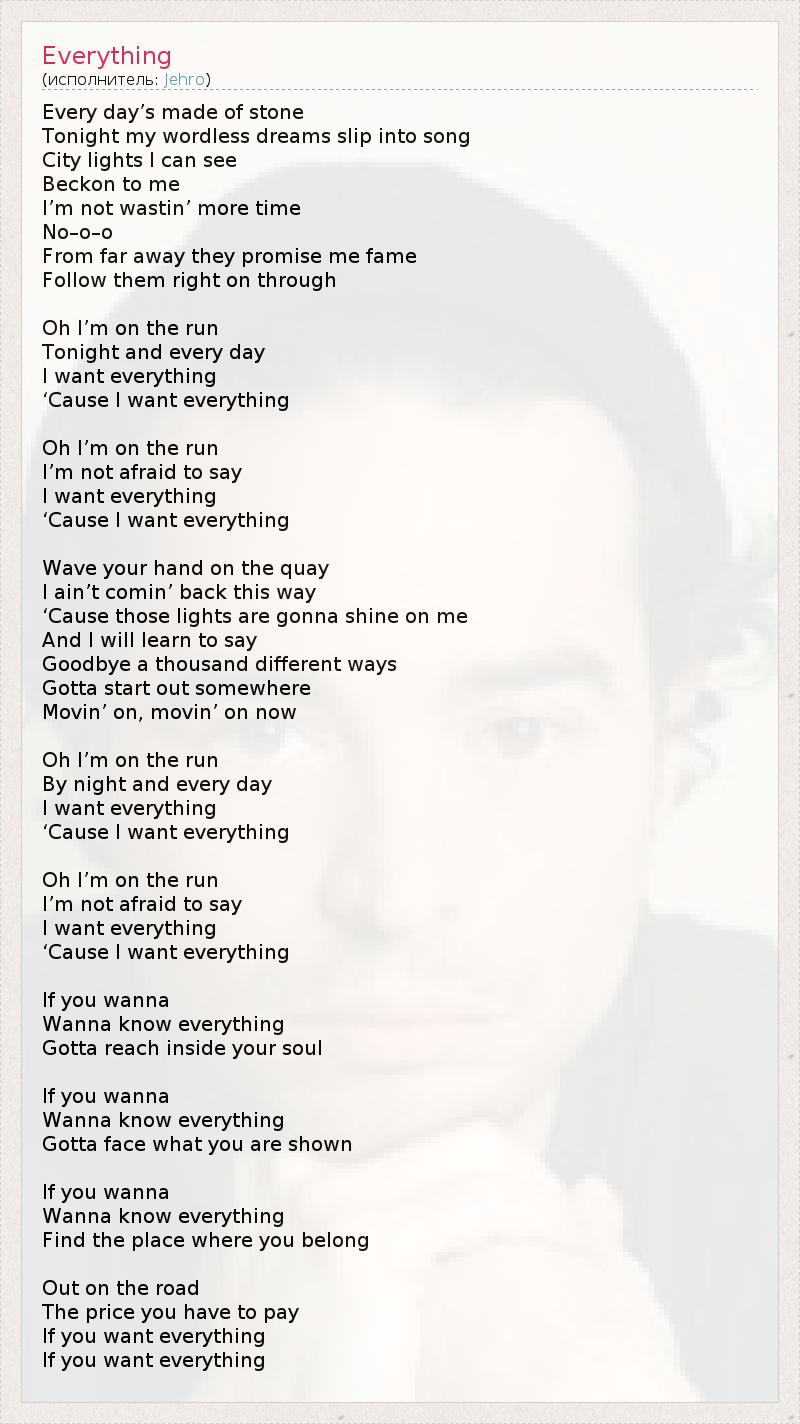 Every day’s made of stone Tonight my wordless dreams slip into song City lights I can see Beckon to me I’m not wastin’ more time No–o–o From far away they promise me fame Follow them right on through Oh I’m on the run Tonight and every day I want everything ‘Cause I want everything Oh I’m on the run I’m not afraid to say I want everything ‘Cause I want everything Wave your hand on the quay I ain’t comin’ back this way ‘Cause those lights are gonna shine on me And I will learn to say Goodbye a thousand different ways Gotta start out somewhere Movin’ on, movin’ on now Oh I’m on the run By night and every day I want everything ‘Cause I want everything Oh I’m on the run I’m not afraid to say I want everything ‘Cause I want everything If you wanna Wanna know everything Gotta reach inside your soul If you wanna Wanna know everything Gotta face what you are shown If you wanna Wanna know everything Find the place where you belong Out on the road The price you have to pay If you want everything If you want everything