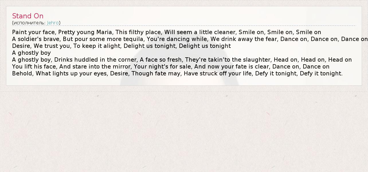 Paint your face, Pretty young Maria, This filthy place, Will seem a little cleaner, Smile on, Smile on, Smile on A soldier's brave, But pour some more tequila, You're dancing while, We drink away the fear, Dance on, Dance on, Dance on Desire, We trust you, To keep it alight, Delight us tonight, Delight us tonight A ghostly boy A ghostly boy, Drinks huddled in the corner, A face so fresh, They're takin'to the slaughter, Head on, Head on, Head on You lift his face, And stare into the mirror, Your night's for sale, And now your fate is clear, Dance on, Dance on Behold, What lights up your eyes, Desire, Though fate may, Have struck off your life, Defy it tonight, Defy it tonight.