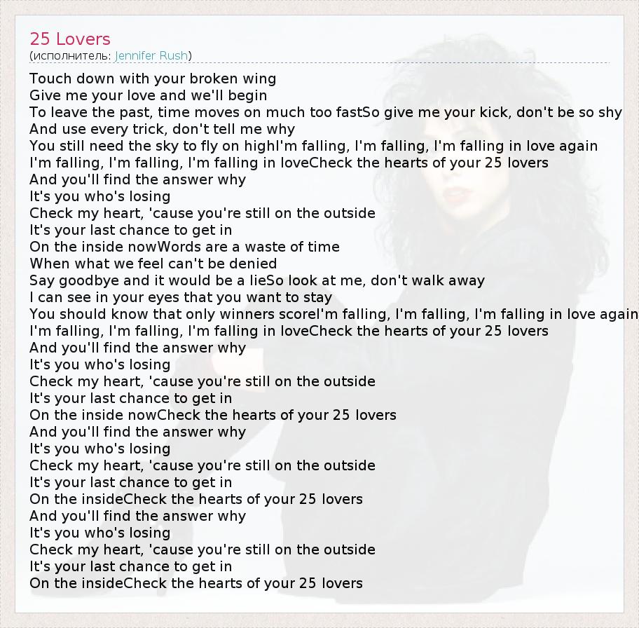 Touch down with your broken wing Give me your love and we'll begin To leave the past, time moves on much too fastSo give me your kick, don't be so shy And use every trick, don't tell me why You still need the sky to fly on highI'm falling, I'm falling, I'm falling in love again I'm falling, I'm falling, I'm falling in loveCheck the hearts of your 25 lovers And you'll find the answer why It's you who's losing Check my heart, 'cause you're still on the outside It's your last chance to get in On the inside nowWords are a waste of time When what we feel can't be denied Say goodbye and it would be a lieSo look at me, don't walk away I can see in your eyes that you want to stay You should know that only winners scoreI'm falling, I'm falling, I'm falling in love again I'm falling, I'm falling, I'm falling in loveCheck the hearts of your 25 lovers And you'll find the answer why It's you who's losing Check my heart, 'cause you're still on the outside It's your last chance to get in On the inside nowCheck the hearts of your 25 lovers And you'll find the answer why It's you who's losing Check my heart, 'cause you're still on the outside It's your last chance to get in On the insideCheck the hearts of your 25 lovers And you'll find the answer why It's you who's losing Check my heart, 'cause you're still on the outside It's your last chance to get in On the insideCheck the hearts of your 25 lovers