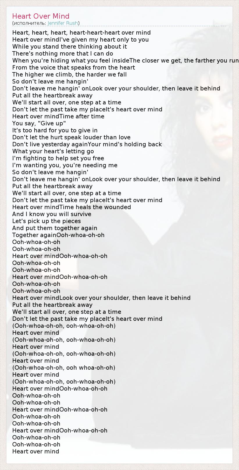 Heart, heart, heart, heart-heart-heart over mind Heart over mindI've given my heart only to you While you stand there thinking about it There's nothing more that I can do When you're hiding what you feel insideThe closer we get, the farther you run From the voice that speaks from the heart The higher we climb, the harder we fall So don't leave me hangin' Don't leave me hangin' onLook over your shoulder, then leave it behind Put all the heartbreak away We'll start all over, one step at a time Don't let the past take my placeIt's heart over mind Heart over mindTime after time You say, "Give up" It's too hard for you to give in Don't let the hurt speak louder than love Don't live yesterday againYour mind's holding back What your heart's letting go I'm fighting to help set you free I'm wanting you, you're needing me So don't leave me hangin' Don't leave me hangin' onLook over your shoulder, then leave it behind Put all the heartbreak away We'll start all over, one step at a time Don't let the past take my placeIt's heart over mind Heart over mindTime heals the wounded And I know you will survive Let's pick up the pieces And put them together again Together againOoh-whoa-oh-oh Ooh-whoa-oh-oh Ooh-whoa-oh-oh Heart over mindOoh-whoa-oh-oh Ooh-whoa-oh-oh Ooh-whoa-oh-oh Heart over mindOoh-whoa-oh-oh Ooh-whoa-oh-oh Ooh-whoa-oh-oh Heart over mindLook over your shoulder, then leave it behind Put all the heartbreak away We'll start all over, one step at a time Don't let the past take my placeIt's heart over mind (Ooh-whoa-oh-oh, ooh-whoa-oh-oh) Heart over mind (Ooh-whoa-oh-oh, ooh-whoa-oh-oh) Heart over mind (Ooh-whoa-oh-oh, ooh-whoa-oh-oh) Heart over mind (Ooh-whoa-oh-oh, ooh whoa-oh-oh) Heart over mind (Ooh-whoa-oh-oh, ooh-whoa-oh-oh) Heart over mindOoh-whoa-oh-oh Ooh-whoa-oh-oh Ooh-whoa-oh-oh Heart over mindOoh-whoa-oh-oh Ooh-whoa-oh-oh Ooh-whoa-oh-oh Heart over mindOoh-whoa-oh-oh Ooh-whoa-oh-oh Ooh-whoa-oh-oh Heart over mind