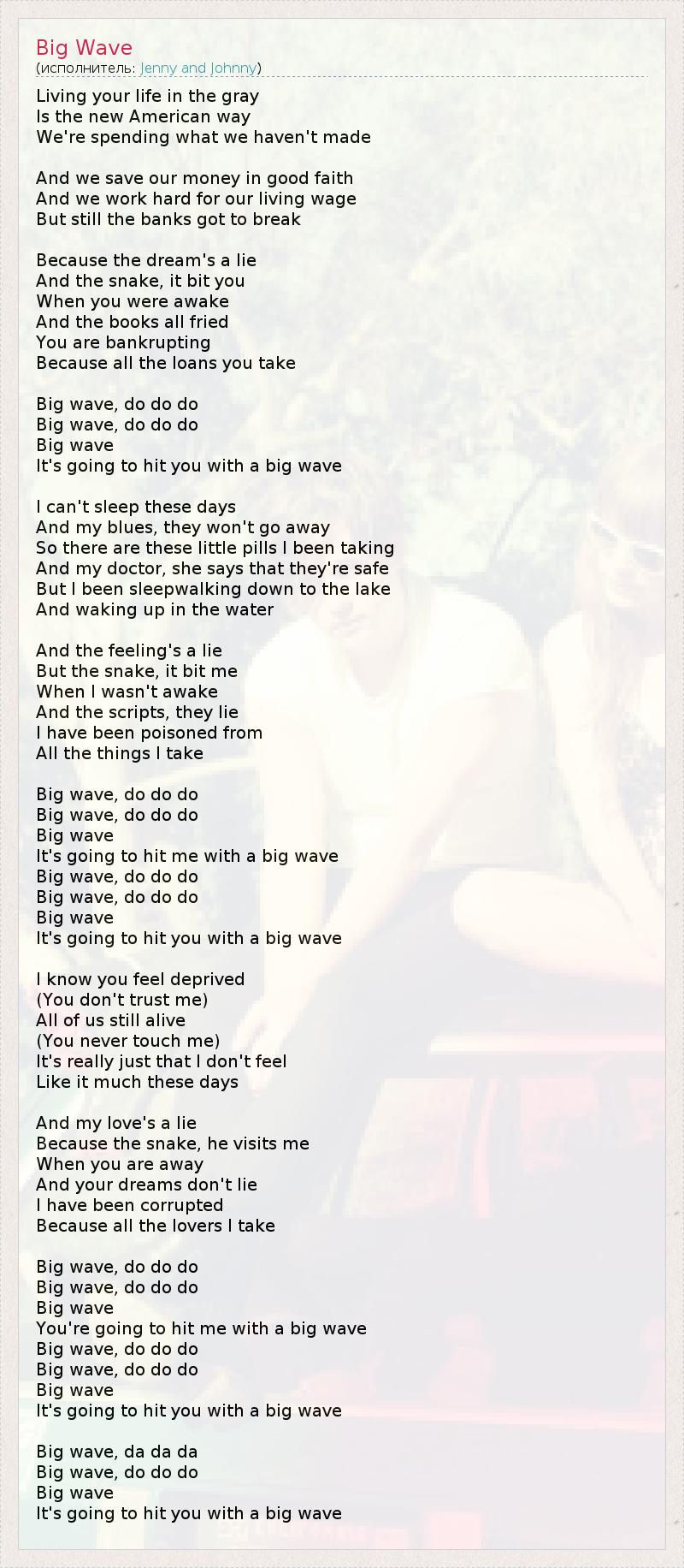 Living your life in the gray Is the new American way We're spending what we haven't made And we save our money in good faith And we work hard for our living wage But still the banks got to break Because the dream's a lie And the snake, it bit you When you were awake And the books all fried You are bankrupting Because all the loans you take Big wave, do do do Big wave, do do do Big wave It's going to hit you with a big wave I can't sleep these days And my blues, they won't go away So there are these little pills I been taking And my doctor, she says that they're safe But I been sleepwalking down to the lake And waking up in the water And the feeling's a lie But the snake, it bit me When I wasn't awake And the scripts, they lie I have been poisoned from All the things I take Big wave, do do do Big wave, do do do Big wave It's going to hit me with a big wave Big wave, do do do Big wave, do do do Big wave It's going to hit you with a big wave I know you feel deprived (You don't trust me) All of us still alive (You never touch me) It's really just that I don't feel Like it much these days And my love's a lie Because the snake, he visits me When you are away And your dreams don't lie I have been corrupted Because all the lovers I take Big wave, do do do Big wave, do do do Big wave You're going to hit me with a big wave Big wave, do do do Big wave, do do do Big wave It's going to hit you with a big wave Big wave, da da da Big wave, do do do Big wave It's going to hit you with a big wave