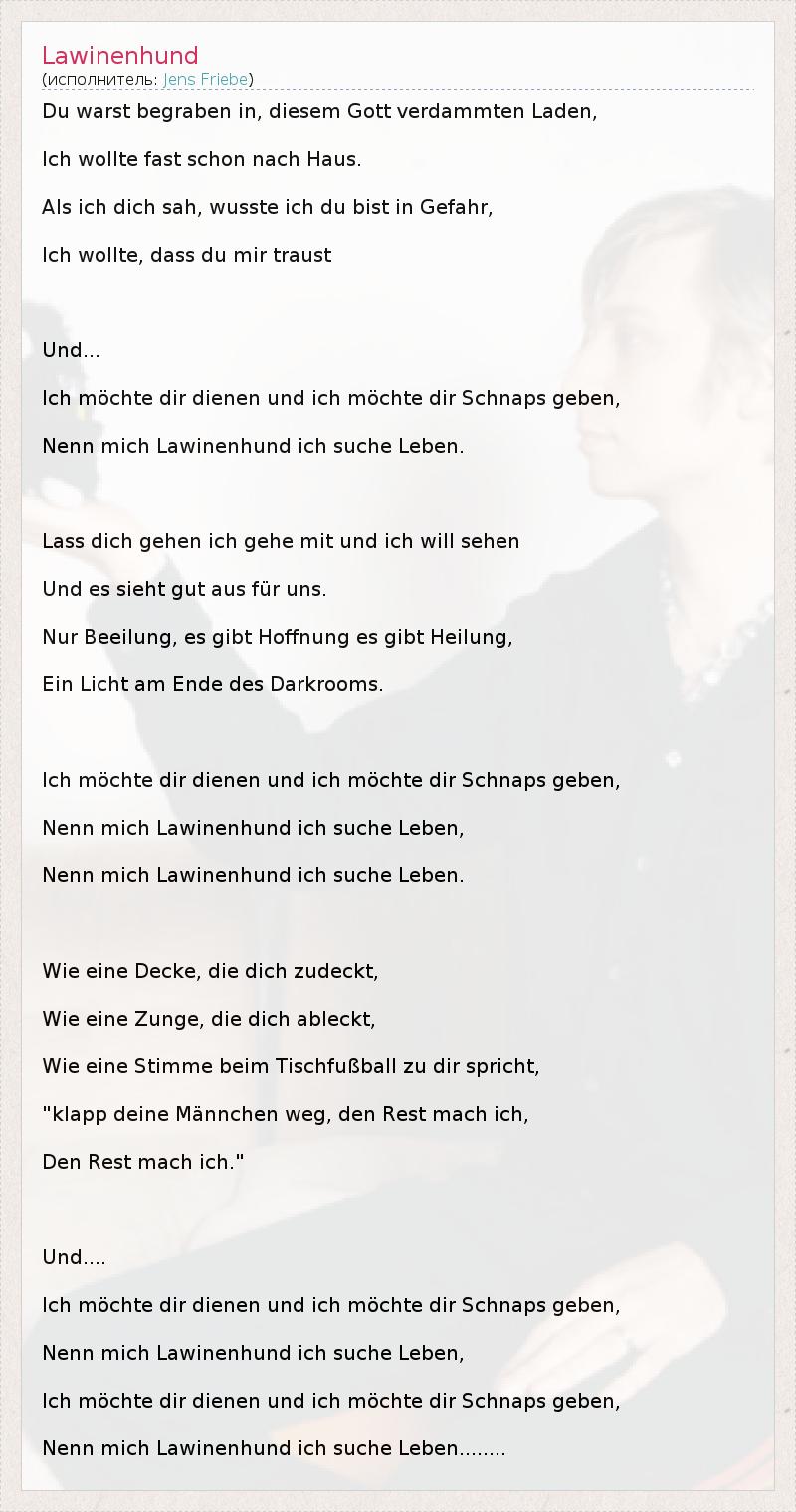 Du warst begraben in, diesem Gott verdammten Laden, Ich wollte fast schon nach Haus. Als ich dich sah, wusste ich du bist in Gefahr, Ich wollte, dass du mir traust Und... Ich möchte dir dienen und ich möchte dir Schnaps geben, Nenn mich Lawinenhund ich suche Leben. Lass dich gehen ich gehe mit und ich will sehen Und es sieht gut aus für uns. Nur Beeilung, es gibt Hoffnung es gibt Heilung, Ein Licht am Ende des Darkrooms. Ich möchte dir dienen und ich möchte dir Schnaps geben, Nenn mich Lawinenhund ich suche Leben, Nenn mich Lawinenhund ich suche Leben. Wie eine Decke, die dich zudeckt, Wie eine Zunge, die dich ableckt, Wie eine Stimme beim Tischfußball zu dir spricht, "klapp deine Männchen weg, den Rest mach ich, Den Rest mach ich." Und.... Ich möchte dir dienen und ich möchte dir Schnaps geben, Nenn mich Lawinenhund ich suche Leben, Ich möchte dir dienen und ich möchte dir Schnaps geben, Nenn mich Lawinenhund ich suche Leben........