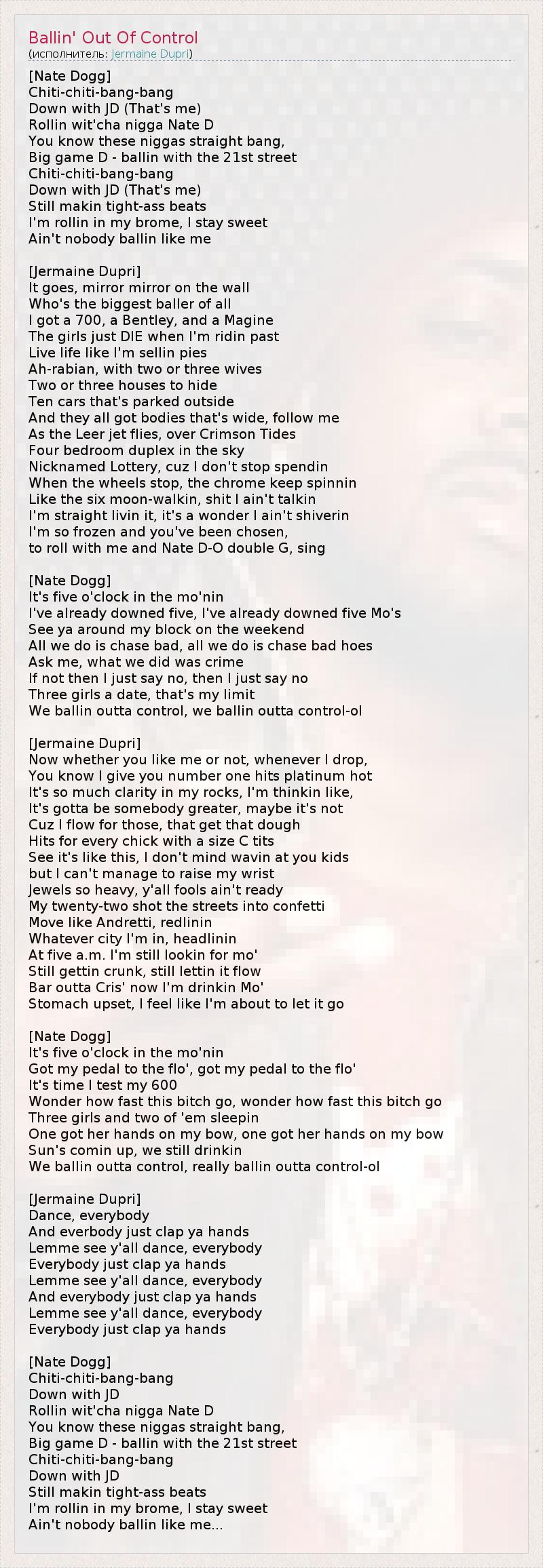 [Nate Dogg] Chiti-chiti-bang-bang Down with JD (That's me) Rollin wit'cha nigga Nate D You know these niggas straight bang, Big game D - ballin with the 21st street Chiti-chiti-bang-bang Down with JD (That's me) Still makin tight-ass beats I'm rollin in my brome, I stay sweet Ain't nobody ballin like me [Jermaine Dupri] It goes, mirror mirror on the wall Who's the biggest baller of all I got a 700, a Bentley, and a Magine The girls just DIE when I'm ridin past Live life like I'm sellin pies Ah-rabian, with two or three wives Two or three houses to hide Ten cars that's parked outside And they all got bodies that's wide, follow me As the Leer jet flies, over Crimson Tides Four bedroom duplex in the sky Nicknamed Lottery, cuz I don't stop spendin When the wheels stop, the chrome keep spinnin Like the six moon-walkin, shit I ain't talkin I'm straight livin it, it's a wonder I ain't shiverin I'm so frozen and you've been chosen, to roll with me and Nate D-O double G, sing [Nate Dogg] It's five o'clock in the mo'nin I've already downed five, I've already downed five Mo's See ya around my block on the weekend All we do is chase bad, all we do is chase bad hoes Ask me, what we did was crime If not then I just say no, then I just say no Three girls a date, that's my limit We ballin outta control, we ballin outta control-ol [Jermaine Dupri] Now whether you like me or not, whenever I drop, You know I give you number one hits platinum hot It's so much clarity in my rocks, I'm thinkin like, It's gotta be somebody greater, maybe it's not Cuz I flow for those, that get that dough Hits for every chick with a size C tits See it's like this, I don't mind wavin at you kids but I can't manage to raise my wrist Jewels so heavy, y'all fools ain't ready My twenty-two shot the streets into confetti Move like Andretti, redlinin Whatever city I'm in, headlinin At five a.m. I'm still lookin for mo' Still gettin crunk, still lettin it flow Bar outta Cris' now I'm drinkin Mo' Stomach upset, I feel like I'm about to let it go [Nate Dogg] It's five o'clock in the mo'nin Got my pedal to the flo', got my pedal to the flo' It's time I test my 600 Wonder how fast this bitch go, wonder how fast this bitch go Three girls and two of 'em sleepin One got her hands on my bow, one got her hands on my bow Sun's comin up, we still drinkin We ballin outta control, really ballin outta control-ol [Jermaine Dupri] Dance, everybody And everbody just clap ya hands Lemme see y'all dance, everybody Everybody just clap ya hands Lemme see y'all dance, everybody And everybody just clap ya hands Lemme see y'all dance, everybody Everybody just clap ya hands [Nate Dogg] Chiti-chiti-bang-bang Down with JD Rollin wit'cha nigga Nate D You know these niggas straight bang, Big game D - ballin with the 21st street Chiti-chiti-bang-bang Down with JD Still makin tight-ass beats I'm rollin in my brome, I stay sweet Ain't nobody ballin like me...