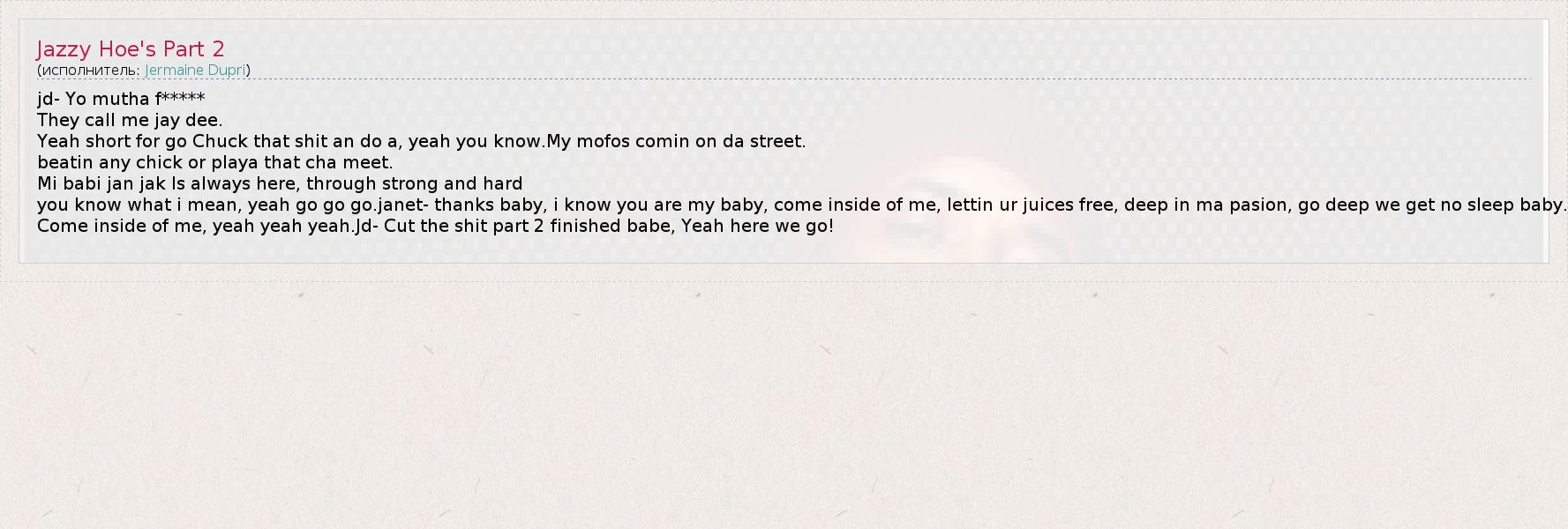 jd- Yo mutha f***** They call me jay dee. Yeah short for go Chuck that shit an do a, yeah you know.My mofos comin on da street. beatin any chick or playa that cha meet. Mi babi jan jak Is always here, through strong and hard you know what i mean, yeah go go go.janet- thanks baby, i know you are my baby, come inside of me, lettin ur juices free, deep in ma pasion, go deep we get no sleep baby. Come inside of me, yeah yeah yeah.Jd- Cut the shit part 2 finished babe, Yeah here we go!