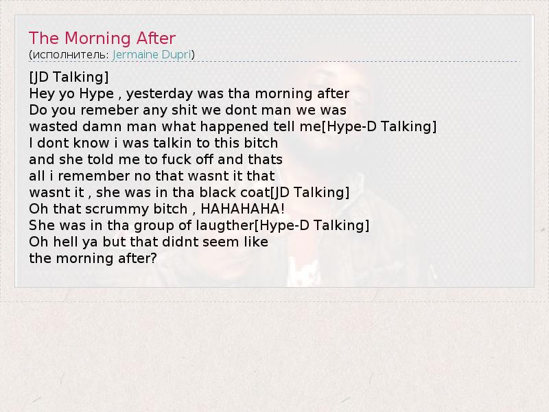 [JD Talking] Hey yo Hype , yesterday was tha morning after Do you remeber any shit we dont man we was wasted damn man what happened tell me[Hype-D Talking] I dont know i was talkin to this bitch and she told me to fuck off and thats all i remember no that wasnt it that wasnt it , she was in tha black coat[JD Talking] Oh that scrummy bitch , HAHAHAHA! She was in tha group of laugther[Hype-D Talking] Oh hell ya but that didnt seem like the morning after?