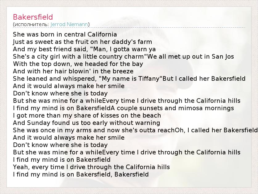 А как ты думаешь, о чем песня "Bakersfield" ?