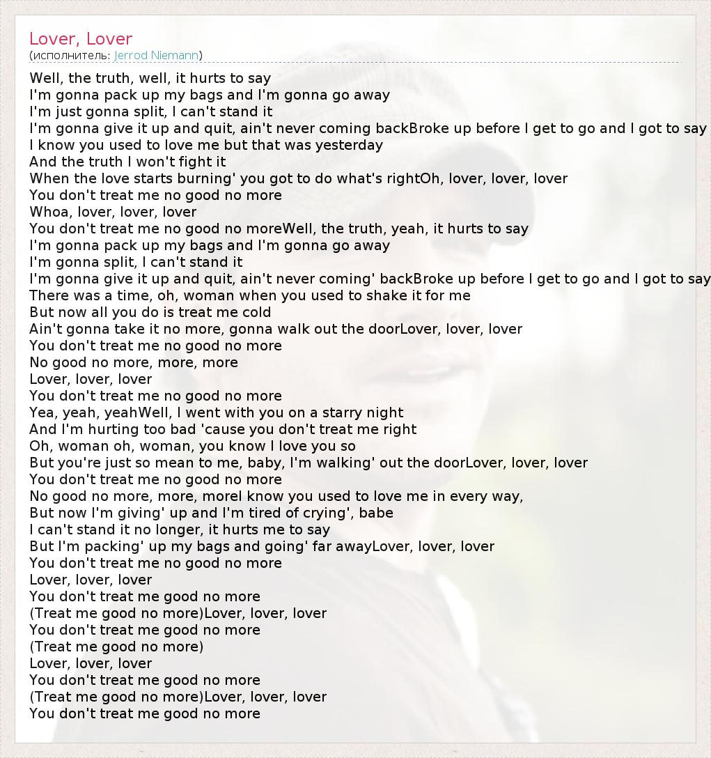 Well, the truth, well, it hurts to say I'm gonna pack up my bags and I'm gonna go away I'm just gonna split, I can't stand it I'm gonna give it up and quit, ain't never coming backBroke up before I get to go and I got to say I know you used to love me but that was yesterday And the truth I won't fight it When the love starts burning' you got to do what's rightOh, lover, lover, lover You don't treat me no good no more Whoa, lover, lover, lover You don't treat me no good no moreWell, the truth, yeah, it hurts to say I'm gonna pack up my bags and I'm gonna go away I'm gonna split, I can't stand it I'm gonna give it up and quit, ain't never coming' backBroke up before I get to go and I got to say There was a time, oh, woman when you used to shake it for me But now all you do is treat me cold Ain't gonna take it no more, gonna walk out the doorLover, lover, lover You don't treat me no good no more No good no more, more, more Lover, lover, lover You don't treat me no good no more Yea, yeah, yeahWell, I went with you on a starry night And I'm hurting too bad 'cause you don't treat me right Oh, woman oh, woman, you know I love you so But you're just so mean to me, baby, I'm walking' out the doorLover, lover, lover You don't treat me no good no more No good no more, more, moreI know you used to love me in every way, But now I'm giving' up and I'm tired of crying', babe I can't stand it no longer, it hurts me to say But I'm packing' up my bags and going' far awayLover, lover, lover You don't treat me no good no more Lover, lover, lover You don't treat me good no more (Treat me good no more)Lover, lover, lover You don't treat me good no more (Treat me good no more) Lover, lover, lover You don't treat me good no more (Treat me good no more)Lover, lover, lover You don't treat me good no more
