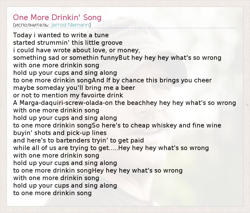 Today i wanted to write a tune started strummin' this little groove i could have wrote about love, or money, something sad or somethin funnyBut hey hey hey what's so wrong with one more drinkin song hold up your cups and sing along to one more drinkin songAnd If by chance this brings you cheer maybe someday you'll bring me a beer or not to mention my favoirte drink A Marga-daquiri-screw-olada-on the beachhey hey hey what's so wrong with one more drinkin song hold up your cups and sing along to one more drinkin songSo here's to cheap whiskey and fine wine buyin' shots and pick-up lines and here's to bartenders tryin' to get paid while all of us are trying to get.....Hey hey hey what's so wrong with one more drinkin song hold up your cups and sing along to one more drinkin songHey hey hey what's so wrong with one more drinkin song hold up your cups and sing along to one more drinkin song