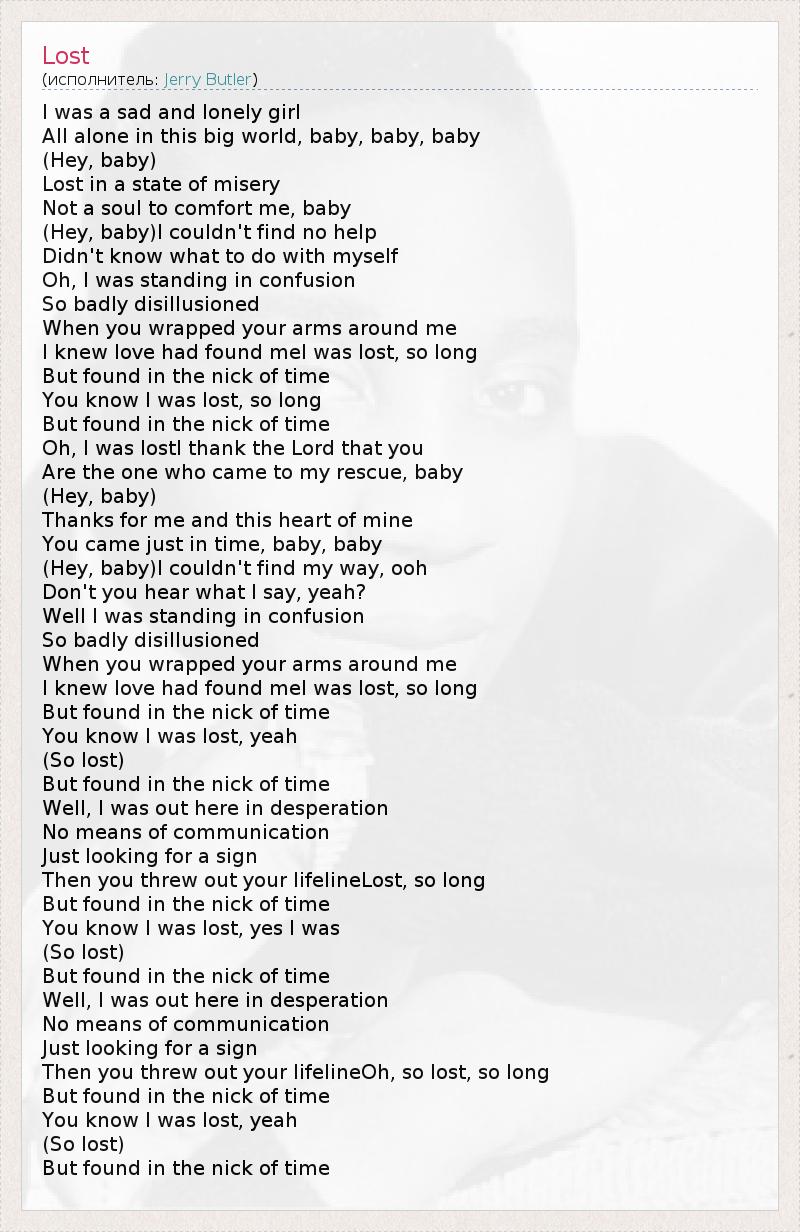 I was a sad and lonely girl All alone in this big world, baby, baby, baby (Hey, baby) Lost in a state of misery Not a soul to comfort me, baby (Hey, baby)I couldn't find no help Didn't know what to do with myself Oh, I was standing in confusion So badly disillusioned When you wrapped your arms around me I knew love had found meI was lost, so long But found in the nick of time You know I was lost, so long But found in the nick of time Oh, I was lostI thank the Lord that you Are the one who came to my rescue, baby (Hey, baby) Thanks for me and this heart of mine You came just in time, baby, baby (Hey, baby)I couldn't find my way, ooh Don't you hear what I say, yeah? Well I was standing in confusion So badly disillusioned When you wrapped your arms around me I knew love had found meI was lost, so long But found in the nick of time You know I was lost, yeah (So lost) But found in the nick of time Well, I was out here in desperation No means of communication Just looking for a sign Then you threw out your lifelineLost, so long But found in the nick of time You know I was lost, yes I was (So lost) But found in the nick of time Well, I was out here in desperation No means of communication Just looking for a sign Then you threw out your lifelineOh, so lost, so long But found in the nick of time You know I was lost, yeah (So lost) But found in the nick of time