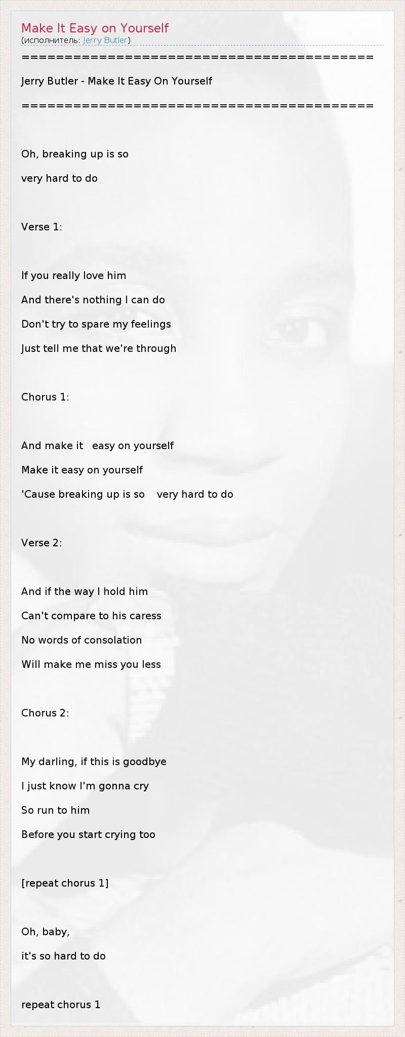 ========================================= Jerry Butler - Make It Easy On Yourself ========================================= Oh, breaking up is so very hard to do Verse 1: If you really love him And there's nothing I can do Don't try to spare my feelings Just tell me that we're through Chorus 1: And make it easy on yourself Make it easy on yourself 'Cause breaking up is so very hard to do Verse 2: And if the way I hold him Can't compare to his caress No words of consolation Will make me miss you less Chorus 2: My darling, if this is goodbye I just know I'm gonna cry So run to him Before you start crying too [repeat chorus 1] Oh, baby, it's so hard to do repeat chorus 1