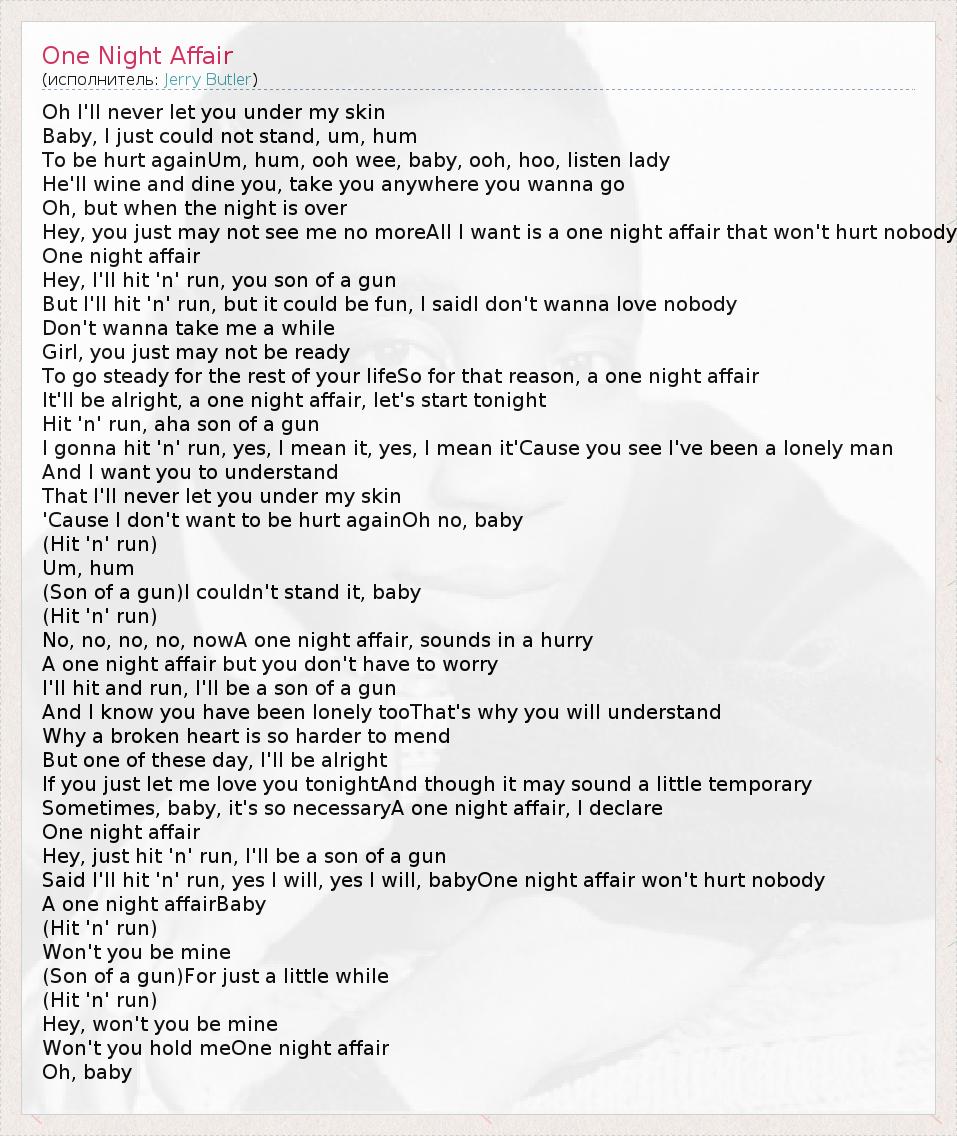 Oh I'll never let you under my skin Baby, I just could not stand, um, hum To be hurt againUm, hum, ooh wee, baby, ooh, hoo, listen lady He'll wine and dine you, take you anywhere you wanna go Oh, but when the night is over Hey, you just may not see me no moreAll I want is a one night affair that won't hurt nobody One night affair Hey, I'll hit 'n' run, you son of a gun But I'll hit 'n' run, but it could be fun, I saidI don't wanna love nobody Don't wanna take me a while Girl, you just may not be ready To go steady for the rest of your lifeSo for that reason, a one night affair It'll be alright, a one night affair, let's start tonight Hit 'n' run, aha son of a gun I gonna hit 'n' run, yes, I mean it, yes, I mean it'Cause you see I've been a lonely man And I want you to understand That I'll never let you under my skin 'Cause I don't want to be hurt againOh no, baby (Hit 'n' run) Um, hum (Son of a gun)I couldn't stand it, baby (Hit 'n' run) No, no, no, no, nowA one night affair, sounds in a hurry A one night affair but you don't have to worry I'll hit and run, I'll be a son of a gun And I know you have been lonely tooThat's why you will understand Why a broken heart is so harder to mend But one of these day, I'll be alright If you just let me love you tonightAnd though it may sound a little temporary Sometimes, baby, it's so necessaryA one night affair, I declare One night affair Hey, just hit 'n' run, I'll be a son of a gun Said I'll hit 'n' run, yes I will, yes I will, babyOne night affair won't hurt nobody A one night affairBaby (Hit 'n' run) Won't you be mine (Son of a gun)For just a little while (Hit 'n' run) Hey, won't you be mine Won't you hold meOne night affair Oh, baby