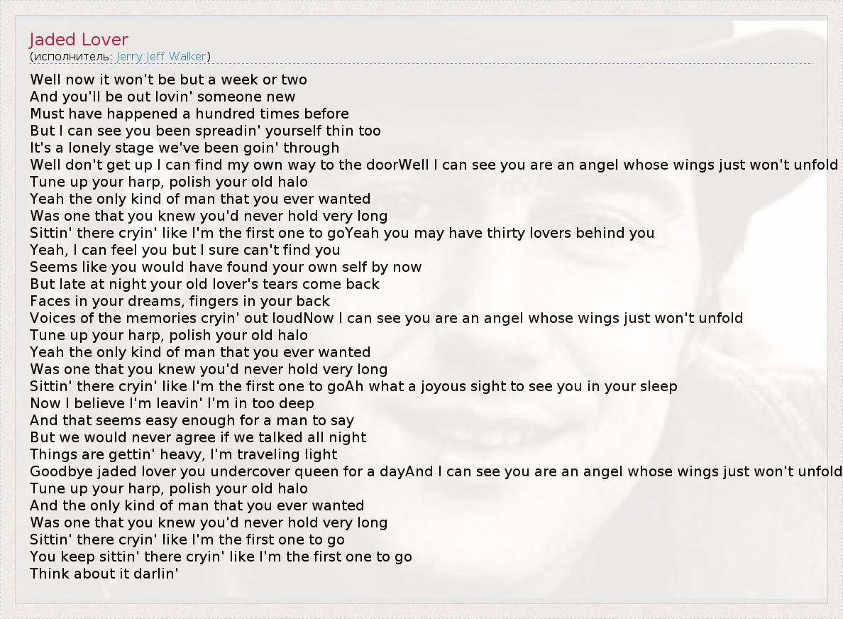 Well now it won't be but a week or two And you'll be out lovin' someone new Must have happened a hundred times before But I can see you been spreadin' yourself thin too It's a lonely stage we've been goin' through Well don't get up I can find my own way to the doorWell I can see you are an angel whose wings just won't unfold Tune up your harp, polish your old halo Yeah the only kind of man that you ever wanted Was one that you knew you'd never hold very long Sittin' there cryin' like I'm the first one to goYeah you may have thirty lovers behind you Yeah, I can feel you but I sure can't find you Seems like you would have found your own self by now But late at night your old lover's tears come back Faces in your dreams, fingers in your back Voices of the memories cryin' out loudNow I can see you are an angel whose wings just won't unfold Tune up your harp, polish your old halo Yeah the only kind of man that you ever wanted Was one that you knew you'd never hold very long Sittin' there cryin' like I'm the first one to goAh what a joyous sight to see you in your sleep Now I believe I'm leavin' I'm in too deep And that seems easy enough for a man to say But we would never agree if we talked all night Things are gettin' heavy, I'm traveling light Goodbye jaded lover you undercover queen for a dayAnd I can see you are an angel whose wings just won't unfold Tune up your harp, polish your old halo And the only kind of man that you ever wanted Was one that you knew you'd never hold very long Sittin' there cryin' like I'm the first one to go You keep sittin' there cryin' like I'm the first one to go Think about it darlin'