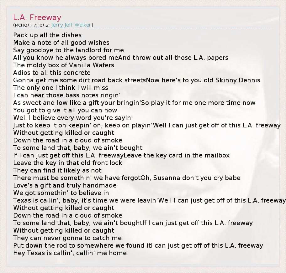 Pack up all the dishes Make a note of all good wishes Say goodbye to the landlord for me All you know he always bored meAnd throw out all those L.A. papers The moldy box of Vanilla Wafers Adios to all this concrete Gonna get me some dirt road back streetsNow here's to you old Skinny Dennis The only one I think I will miss I can hear those bass notes ringin' As sweet and low like a gift your bringin'So play it for me one more time now You got to give it all you can now Well I believe every word you're sayin' Just to keep it on keepin' on, keep on playin'Well I can just get off of this L.A. freeway Without getting killed or caught Down the road in a cloud of smoke To some land that, baby, we ain't bought If I can just get off this L.A. freewayLeave the key card in the mailbox Leave the key in that old front lock They can find it likely as not There must be somethin' we have forgotOh, Susanna don't you cry babe Love's a gift and truly handmade We got somethin' to believe in Texas is callin', baby, it's time we were leavin'Well I can just get off of this L.A. freeway Without getting killed or caught Down the road in a cloud of smoke To some land that, baby, we ain't boughtIf I can just get off this L.A. freeway Without getting killed or caught They can never gonna to catch me Put down the rod to somewhere we found itI can just get off of this L.A. freeway Hey Texas is callin', callin' me home