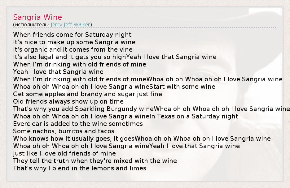 When friends come for Saturday night It's nice to make up some Sangria wine It's organic and it comes from the vine It's also legal and it gets you so highYeah I love that Sangria wine When I'm drinking with old friends of mine Yeah I love that Sangria wine When I'm drinking with old friends of mineWhoa oh oh Whoa oh oh I love Sangria wine Whoa oh oh Whoa oh oh I love Sangria wineStart with some wine Get some apples and brandy and sugar just fine Old friends always show up on time That's why you add Sparkling Burgundy wineWhoa oh oh Whoa oh oh I love Sangria wine Whoa oh oh Whoa oh oh I love Sangria wineIn Texas on a Saturday night Everclear is added to the wine sometimes Some nachos, burritos and tacos Who knows how it usually goes, it goesWhoa oh oh Whoa oh oh I love Sangria wine Whoa oh oh Whoa oh oh I love Sangria wineYeah I love that Sangria wine Just like I love old friends of mine They tell the truth when they're mixed with the wine That's why I blend in the lemons and limes