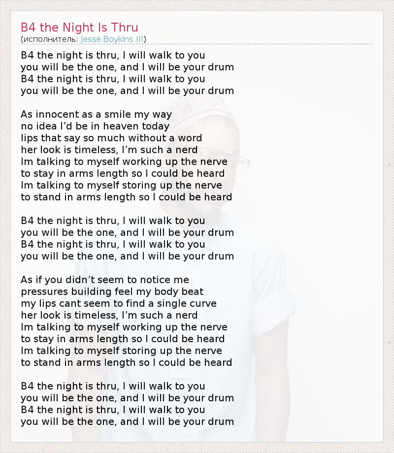 B4 the night is thru, I will walk to you you will be the one, and I will be your drum B4 the night is thru, I will walk to you you will be the one, and I will be your drum As innocent as a smile my way no idea I’d be in heaven today lips that say so much without a word her look is timeless, I’m such a nerd Im talking to myself working up the nerve to stay in arms length so I could be heard Im talking to myself storing up the nerve to stand in arms length so I could be heard B4 the night is thru, I will walk to you you will be the one, and I will be your drum B4 the night is thru, I will walk to you you will be the one, and I will be your drum As if you didn’t seem to notice me pressures building feel my body beat my lips cant seem to find a single curve her look is timeless, I’m such a nerd Im talking to myself working up the nerve to stay in arms length so I could be heard Im talking to myself storing up the nerve to stand in arms length so I could be heard B4 the night is thru, I will walk to you you will be the one, and I will be your drum B4 the night is thru, I will walk to you you will be the one, and I will be your drum