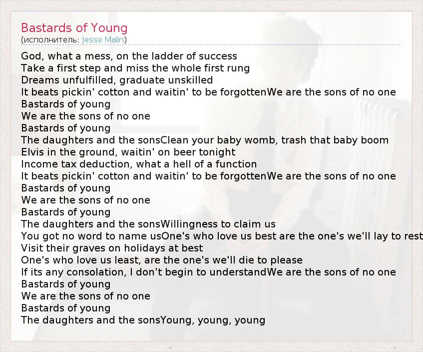 God, what a mess, on the ladder of success Take a first step and miss the whole first rung Dreams unfulfilled, graduate unskilled It beats pickin' cotton and waitin' to be forgottenWe are the sons of no one Bastards of young We are the sons of no one Bastards of young The daughters and the sonsClean your baby womb, trash that baby boom Elvis in the ground, waitin' on beer tonight Income tax deduction, what a hell of a function It beats pickin' cotton and waitin' to be forgottenWe are the sons of no one Bastards of young We are the sons of no one Bastards of young The daughters and the sonsWillingness to claim us You got no word to name usOne's who love us best are the one's we'll lay to rest Visit their graves on holidays at best One's who love us least, are the one's we'll die to please If its any consolation, I don't begin to understandWe are the sons of no one Bastards of young We are the sons of no one Bastards of young The daughters and the sonsYoung, young, young