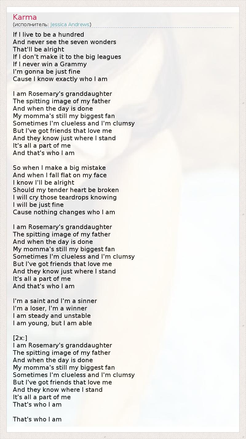 Если я доживу до ста лет, Но так и не увижу семь чудес света, То ничего страшного. Если я не смогу выбиться в люди, Если никогда не получу Грэмми, Думаю, как-нибудь переживу, Ведь я точно знаю, кто я есть. Я - внучка Розмари, Я - точная копия своего отца, И в конечном итоге 1 Моя мама - мой самый большой фанат. Иногда я невежественна и груба, Но у меня есть друзья, которые любят меня, И они знают на что я способна. Всё это - часть меня, И это то, кто я есть. Когда я совершаю большую ошибку, И когда я терплю неудачу, То не расстраиваюсь. Если моё нежное сердце разобьётся, Я пролью слёзы, зная, Что всё будет хорошо, Ведь ничто не изменит того, кто я есть. Я - внучка Розмари, Я - точная копия своего отца, И в конечном итоге Моя мама - мой самый большой фанат. Иногда я невежественна и груба, Но у меня есть друзья, которые любят меня, И они знают на что я способна. Всё это - часть меня, И это то, кто я есть. Я святая, и я грешница, Я неудачница, я победитель. Я непоколебима, но изменчива, Я неопытна, но на многое способна. [2x:] Я - внучка Розмари, Я - точная копия своего отца, И в конечном итоге Моя мама - мой самый большой фанат. Иногда я невежественна и груба, Но у меня есть друзья, которые любят меня, И они знают, на что я способна. Всё это - часть меня, И это то, кто я есть. И это то, кто я есть. 1 - дословно: на закате/под конец дня