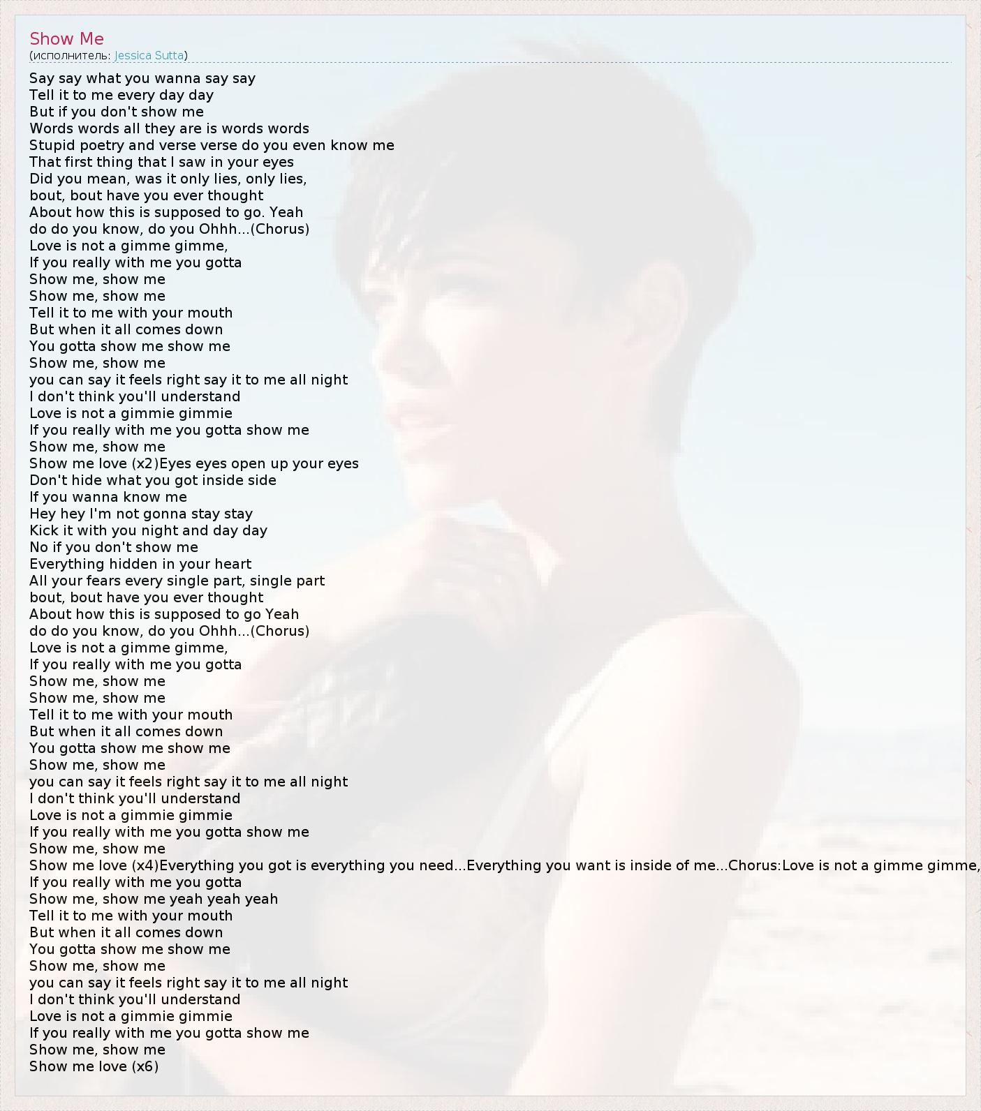 Say say what you wanna say say Tell it to me every day day But if you don't show me Words words all they are is words words Stupid poetry and verse verse do you even know me That first thing that I saw in your eyes Did you mean, was it only lies, only lies, bout, bout have you ever thought About how this is supposed to go. Yeah do do you know, do you Ohhh...(Chorus) Love is not a gimme gimme, If you really with me you gotta Show me, show me Show me, show me Tell it to me with your mouth But when it all comes down You gotta show me show me Show me, show me you can say it feels right say it to me all night I don't think you'll understand Love is not a gimmie gimmie If you really with me you gotta show me Show me, show me Show me love (x2)Eyes eyes open up your eyes Don't hide what you got inside side If you wanna know me Hey hey I'm not gonna stay stay Kick it with you night and day day No if you don't show me Everything hidden in your heart All your fears every single part, single part bout, bout have you ever thought About how this is supposed to go Yeah do do you know, do you Ohhh...(Chorus) Love is not a gimme gimme, If you really with me you gotta Show me, show me Show me, show me Tell it to me with your mouth But when it all comes down You gotta show me show me Show me, show me you can say it feels right say it to me all night I don't think you'll understand Love is not a gimmie gimmie If you really with me you gotta show me Show me, show me Show me love (x4)Everything you got is everything you need...Everything you want is inside of me...Chorus:Love is not a gimme gimme, If you really with me you gotta Show me, show me yeah yeah yeah Tell it to me with your mouth But when it all comes down You gotta show me show me Show me, show me you can say it feels right say it to me all night I don't think you'll understand Love is not a gimmie gimmie If you really with me you gotta show me Show me, show me Show me love (x6)
