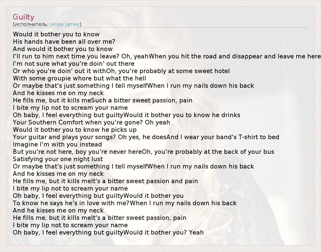 Oh baby, I feel everything but guiltyWould it bother you? Yeah