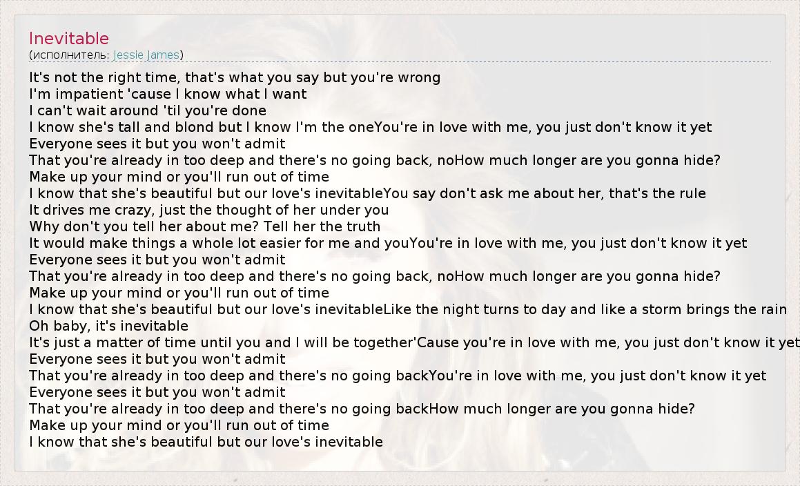 I know that she's beautiful but our love's inevitableLike the night turns to day and like a storm brings the rain