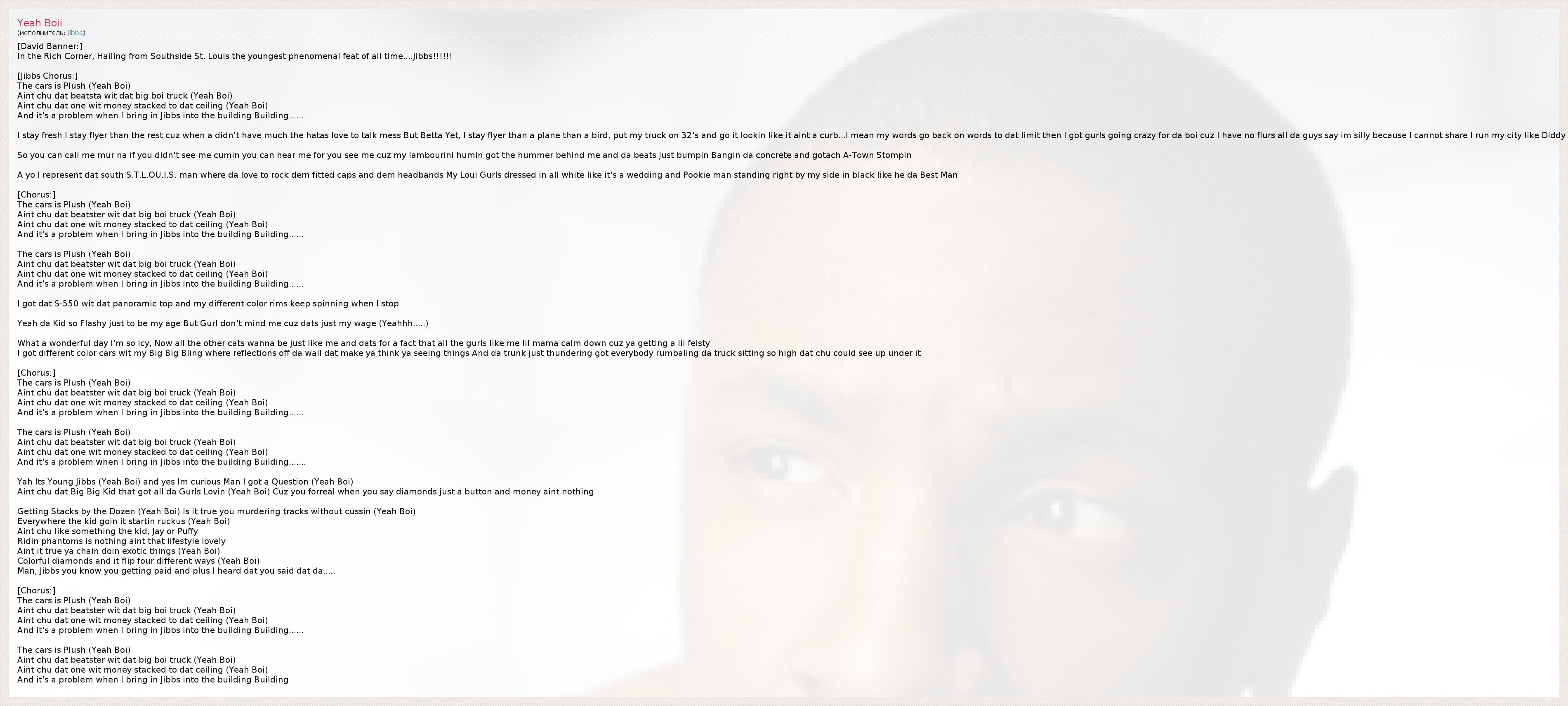 [David Banner:] In the Rich Corner, Hailing from Southside St. Louis the youngest phenomenal feat of all time....Jibbs!!!!!! [Jibbs Chorus:] The cars is Plush (Yeah Boi) Aint chu dat beatsta wit dat big boi truck (Yeah Boi) Aint chu dat one wit money stacked to dat ceiling (Yeah Boi) And it's a problem when I bring in Jibbs into the building Building...... I stay fresh I stay flyer than the rest cuz when a didn't have much the hatas love to talk mess But Betta Yet, I stay flyer than a plane than a bird, put my truck on 32's and go it lookin like it aint a curb...I mean my words go back on words to dat limit then I got gurls going crazy for da boi cuz I have no flurs all da guys say im silly because I cannot share I run my city like Diddy So you can call me mur na if you didn't see me cumin you can hear me for you see me cuz my lambourini humin got the hummer behind me and da beats just bumpin Bangin da concrete and gotach A-Town Stompin A yo I represent dat south S.T.L.OU.I.S. man where da love to rock dem fitted caps and dem headbands My Loui Gurls dressed in all white like it's a wedding and Pookie man standing right by my side in black like he da Best Man [Chorus:] The cars is Plush (Yeah Boi) Aint chu dat beatster wit dat big boi truck (Yeah Boi) Aint chu dat one wit money stacked to dat ceiling (Yeah Boi) And it's a problem when I bring in Jibbs into the building Building...... The cars is Plush (Yeah Boi) Aint chu dat beatster wit dat big boi truck (Yeah Boi) Aint chu dat one wit money stacked to dat ceiling (Yeah Boi) And it's a problem when I bring in Jibbs into the building Building...... I got dat S-550 wit dat panoramic top and my different color rims keep spinning when I stop Yeah da Kid so Flashy just to be my age But Gurl don't mind me cuz dats just my wage (Yeahhh.....) What a wonderful day I'm so Icy, Now all the other cats wanna be just like me and dats for a fact that all the gurls like me lil mama calm down cuz ya getting a lil feisty I got different color cars wit my Big Big Bling where reflections off da wall dat make ya think ya seeing things And da trunk just thundering got everybody rumbaling da truck sitting so high dat chu could see up under it [Chorus:] The cars is Plush (Yeah Boi) Aint chu dat beatster wit dat big boi truck (Yeah Boi) Aint chu dat one wit money stacked to dat ceiling (Yeah Boi) And it's a problem when I bring in Jibbs into the building Building...... The cars is Plush (Yeah Boi) Aint chu dat beatster wit dat big boi truck (Yeah Boi) Aint chu dat one wit money stacked to dat ceiling (Yeah Boi) And it's a problem when I bring in Jibbs into the building Building....... Yah Its Young Jibbs (Yeah Boi) and yes Im curious Man I got a Question (Yeah Boi) Aint chu dat Big Big Kid that got all da Gurls Lovin (Yeah Boi) Cuz you forreal when you say diamonds just a button and money aint nothing Getting Stacks by the Dozen (Yeah Boi) Is it true you murdering tracks without cussin (Yeah Boi) Everywhere the kid goin it startin ruckus (Yeah Boi) Aint chu like something the kid, Jay or Puffy Ridin phantoms is nothing aint that lifestyle lovely Aint it true ya chain doin exotic things (Yeah Boi) Colorful diamonds and it flip four different ways (Yeah Boi) Man, Jibbs you know you getting paid and plus I heard dat you said dat da..... [Chorus:] The cars is Plush (Yeah Boi) Aint chu dat beatster wit dat big boi truck (Yeah Boi) Aint chu dat one wit money stacked to dat ceiling (Yeah Boi) And it's a problem when I bring in Jibbs into the building Building...... The cars is Plush (Yeah Boi) Aint chu dat beatster wit dat big boi truck (Yeah Boi) Aint chu dat one wit money stacked to dat ceiling (Yeah Boi) And it's a problem when I bring in Jibbs into the building Building