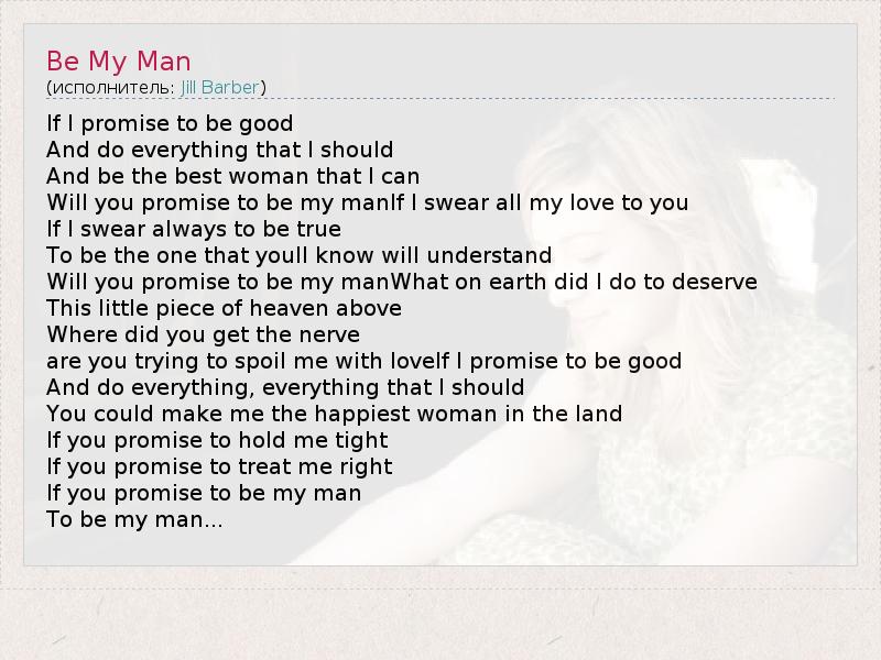 If I promise to be good And do everything that I should And be the best woman that I can Will you promise to be my manIf I swear all my love to you If I swear always to be true To be the one that youll know will understand Will you promise to be my manWhat on earth did I do to deserve This little piece of heaven above Where did you get the nerve are you trying to spoil me with loveIf I promise to be good And do everything, everything that I should You could make me the happiest woman in the land If you promise to hold me tight If you promise to treat me right If you promise to be my man To be my man...
