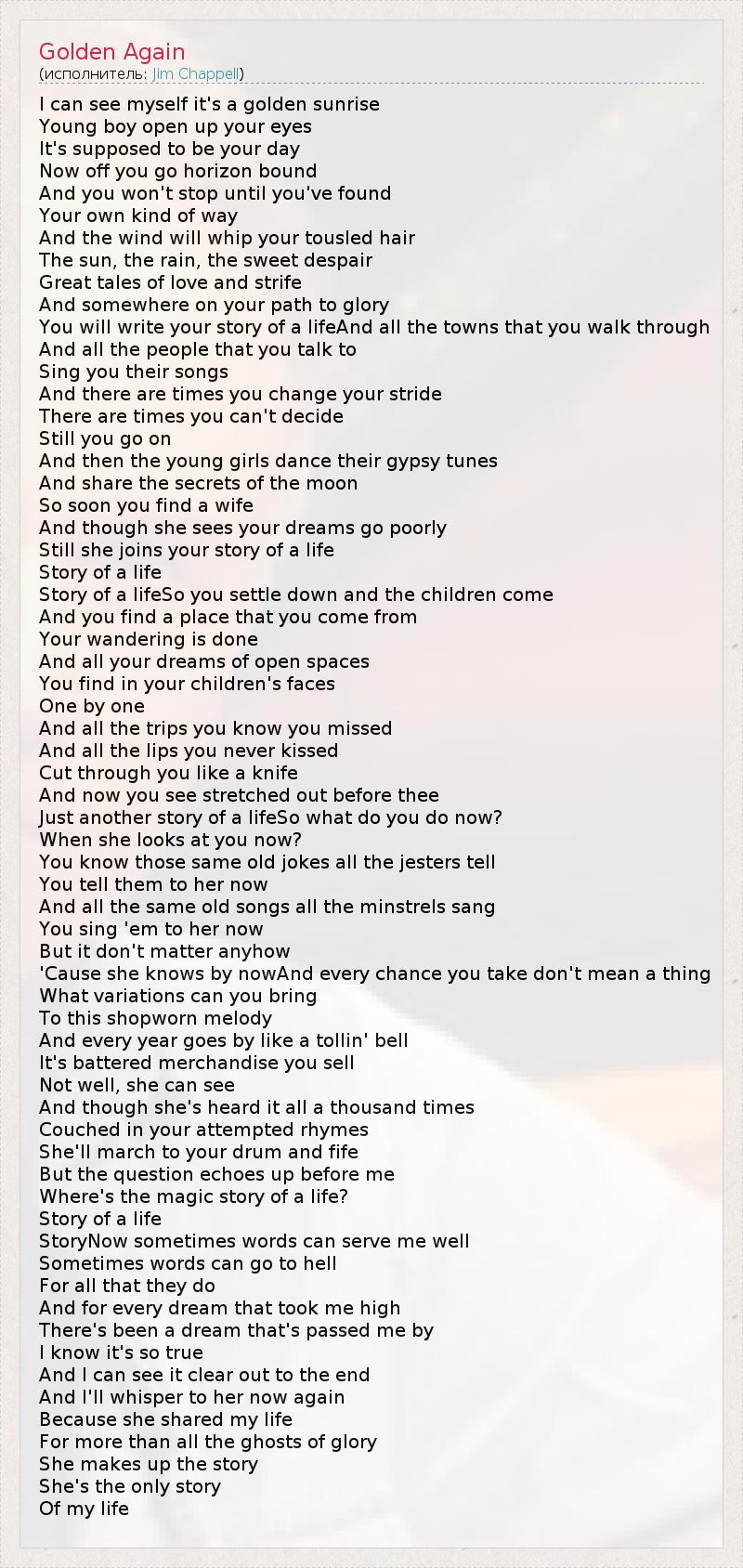 I can see myself it's a golden sunrise Young boy open up your eyes It's supposed to be your day Now off you go horizon bound And you won't stop until you've found Your own kind of way And the wind will whip your tousled hair The sun, the rain, the sweet despair Great tales of love and strife And somewhere on your path to glory You will write your story of a lifeAnd all the towns that you walk through And all the people that you talk to Sing you their songs And there are times you change your stride There are times you can't decide Still you go on And then the young girls dance their gypsy tunes And share the secrets of the moon So soon you find a wife And though she sees your dreams go poorly Still she joins your story of a life Story of a life Story of a lifeSo you settle down and the children come And you find a place that you come from Your wandering is done And all your dreams of open spaces You find in your children's faces One by one And all the trips you know you missed And all the lips you never kissed Cut through you like a knife And now you see stretched out before thee Just another story of a lifeSo what do you do now? When she looks at you now? You know those same old jokes all the jesters tell You tell them to her now And all the same old songs all the minstrels sang You sing 'em to her now But it don't matter anyhow 'Cause she knows by nowAnd every chance you take don't mean a thing What variations can you bring To this shopworn melody And every year goes by like a tollin' bell It's battered merchandise you sell Not well, she can see And though she's heard it all a thousand times Couched in your attempted rhymes She'll march to your drum and fife But the question echoes up before me Where's the magic story of a life? Story of a life StoryNow sometimes words can serve me well Sometimes words can go to hell For all that they do And for every dream that took me high There's been a dream that's passed me by I know it's so true And I can see it clear out to the end And I'll whisper to her now again Because she shared my life For more than all the ghosts of glory She makes up the story She's the only story Of my life