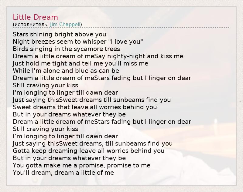 Stars shining bright above you Night breezes seem to whisper "I love you" Birds singing in the sycamore trees Dream a little dream of meSay nighty-night and kiss me Just hold me tight and tell me you'll miss me While I'm alone and blue as can be Dream a little dream of meStars fading but I linger on dear Still craving your kiss I'm longing to linger till dawn dear Just saying thisSweet dreams till sunbeams find you Sweet dreams that leave all worries behind you But in your dreams whatever they be Dream a little dream of meStars fading but I linger on dear Still craving your kiss I'm longing to linger till dawn dear Just saying thisSweet dreams, till sunbeams find you Gotta keep dreaming leave all worries behind you But in your dreams whatever they be You gotta make me a promise, promise to me You'll dream, dream a little of me