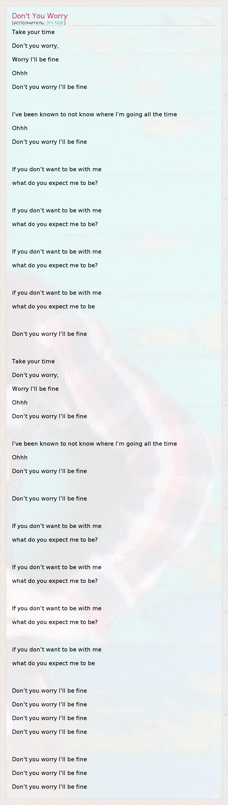 Take your time Don't you worry, Worry I'll be fine Ohhh Don't you worry I'll be fine I've been known to not know where I'm going all the time Ohhh Don't you worry I'll be fine If you don't want to be with me what do you expect me to be? If you don't want to be with me what do you expect me to be? If you don't want to be with me what do you expect me to be? if you don't want to be with me what do you expect me to be Don't you worry I'll be fine Take your time Don't you worry, Worry I'll be fine Ohhh Don't you worry I'll be fine I've been known to not know where I'm going all the time Ohhh Don't you worry I'll be fine Don't you worry I'll be fine If you don't want to be with me what do you expect me to be? If you don't want to be with me what do you expect me to be? If you don't want to be with me what do you expect me to be? if you don't want to be with me what do you expect me to be Don't you worry I'll be fine Don't you worry I'll be fine Don't you worry I'll be fine Don't you worry I'll be fine Don't you worry I'll be fine Don't you worry I'll be fine Don't you worry I'll be fine