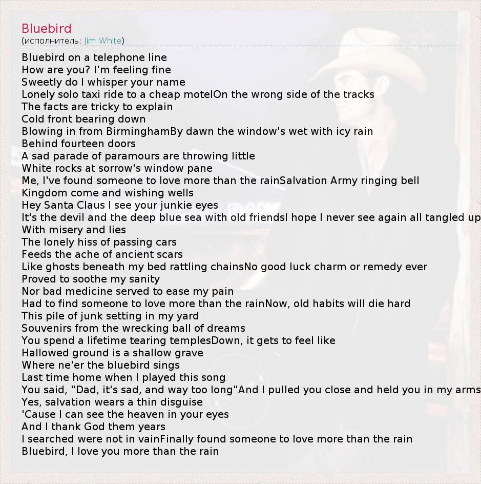 Bluebird on a telephone line How are you? I'm feeling fine Sweetly do I whisper your name Lonely solo taxi ride to a cheap motelOn the wrong side of the tracks The facts are tricky to explain Cold front bearing down Blowing in from BirminghamBy dawn the window's wet with icy rain Behind fourteen doors A sad parade of paramours are throwing little White rocks at sorrow's window pane Me, I've found someone to love more than the rainSalvation Army ringing bell Kingdom come and wishing wells Hey Santa Claus I see your junkie eyes It's the devil and the deep blue sea with old friendsI hope I never see again all tangled up With misery and lies The lonely hiss of passing cars Feeds the ache of ancient scars Like ghosts beneath my bed rattling chainsNo good luck charm or remedy ever Proved to soothe my sanity Nor bad medicine served to ease my pain Had to find someone to love more than the rainNow, old habits will die hard This pile of junk setting in my yard Souvenirs from the wrecking ball of dreams You spend a lifetime tearing templesDown, it gets to feel like Hallowed ground is a shallow grave Where ne'er the bluebird sings Last time home when I played this song You said, "Dad, it's sad, and way too long"And I pulled you close and held you in my arms Yes, salvation wears a thin disguise 'Cause I can see the heaven in your eyes And I thank God them years I searched were not in vainFinally found someone to love more than the rain Bluebird, I love you more than the rain