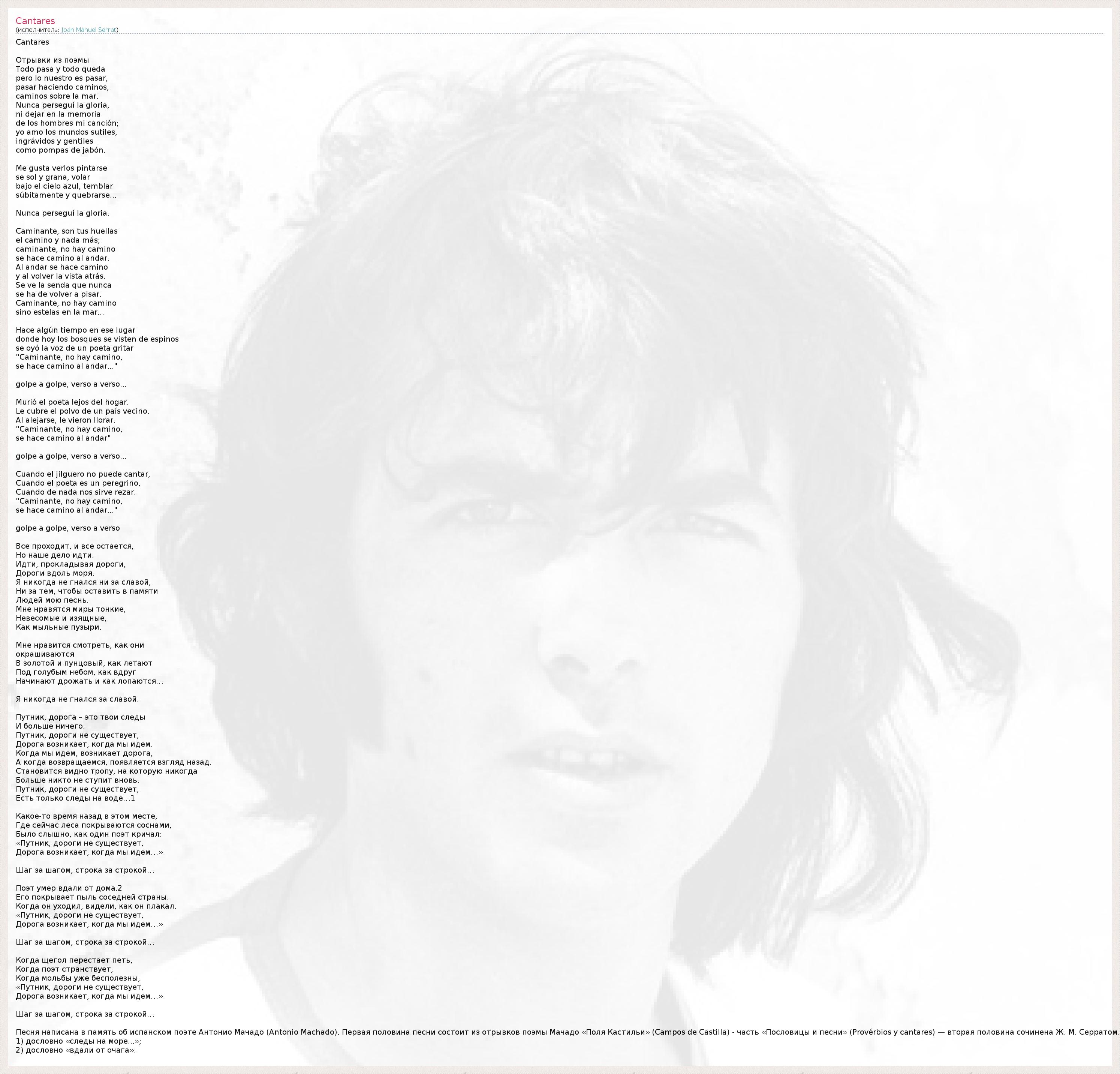 Cantares Отрывки из поэмы Todo pasa y todo queda pero lo nuestro es pasar, pasar haciendo caminos, caminos sobre la mar. Nunca perseguí la gloria, ni dejar en la memoria de los hombres mi canción; yo amo los mundos sutiles, ingrávidos y gentiles como pompas de jabón. Me gusta verlos pintarse se sol y grana, volar bajo el cielo azul, temblar súbitamente y quebrarse... Nunca perseguí la gloria. Caminante, son tus huellas el camino y nada más; caminante, no hay camino se hace camino al andar. Al andar se hace camino y al volver la vista atrás. Se ve la senda que nunca se ha de volver a pisar. Caminante, no hay camino sino estelas en la mar... Hace algún tiempo en ese lugar donde hoy los bosques se visten de espinos se oyó la voz de un poeta gritar "Caminante, no hay camino, se hace camino al andar..." golpe a golpe, verso a verso... Murió el poeta lejos del hogar. Le cubre el polvo de un país vecino. Al alejarse, le vieron llorar. "Caminante, no hay camino, se hace camino al andar" golpe a golpe, verso a verso... Cuando el jilguero no puede cantar, Cuando el poeta es un peregrino, Cuando de nada nos sirve rezar. "Caminante, no hay camino, se hace camino al andar..." golpe a golpe, verso a verso Все проходит, и все остается, Но наше дело идти. Идти, прокладывая дороги, Дороги вдоль моря. Я никогда не гнался ни за славой, Ни за тем, чтобы оставить в памяти Людей мою песнь. Мне нравятся миры тонкие, Невесомые и изящные, Как мыльные пузыри. Мне нравится смотреть, как они окрашиваются В золотой и пунцовый, как летают Под голубым небом, как вдруг Начинают дрожать и как лопаются… Я никогда не гнался за славой. Путник, дорога – это твои следы И больше ничего. Путник, дороги не существует, Дорога возникает, когда мы идем. Когда мы идем, возникает дорога, А когда возвращаемся, появляется взгляд назад. Становится видно тропу, на которую никогда Больше никто не ступит вновь. Путник, дороги не существует, Есть только следы на воде…1 Какое-то время назад в этом месте, Где сейчас леса покрываются соснами, Было слышно, как один поэт кричал: «Путник, дороги не существует, Дорога возникает, когда мы идем…» Шаг за шагом, строка за строкой… Поэт умер вдали от дома.2 Его покрывает пыль соседней страны. Когда он уходил, видели, как он плакал. «Путник, дороги не существует, Дорога возникает, когда мы идем…» Шаг за шагом, строка за строкой… Когда щегол перестает петь, Когда поэт странствует, Когда мольбы уже бесполезны, «Путник, дороги не существует, Дорога возникает, когда мы идем…» Шаг за шагом, строка за строкой… Песня написана в память об иcпанском поэте Антонио Мачадо (Antonio Machado). Первая половина песни состоит из отрывков поэмы Мачадо «Поля Кастильи» (Campos de Castilla) - часть «Пословицы и песни» (Provérbios y cantares) — вторая половина сочинена Ж. М. Серратом. 1) дословно «следы на море...»; 2) дословно «вдали от очага».