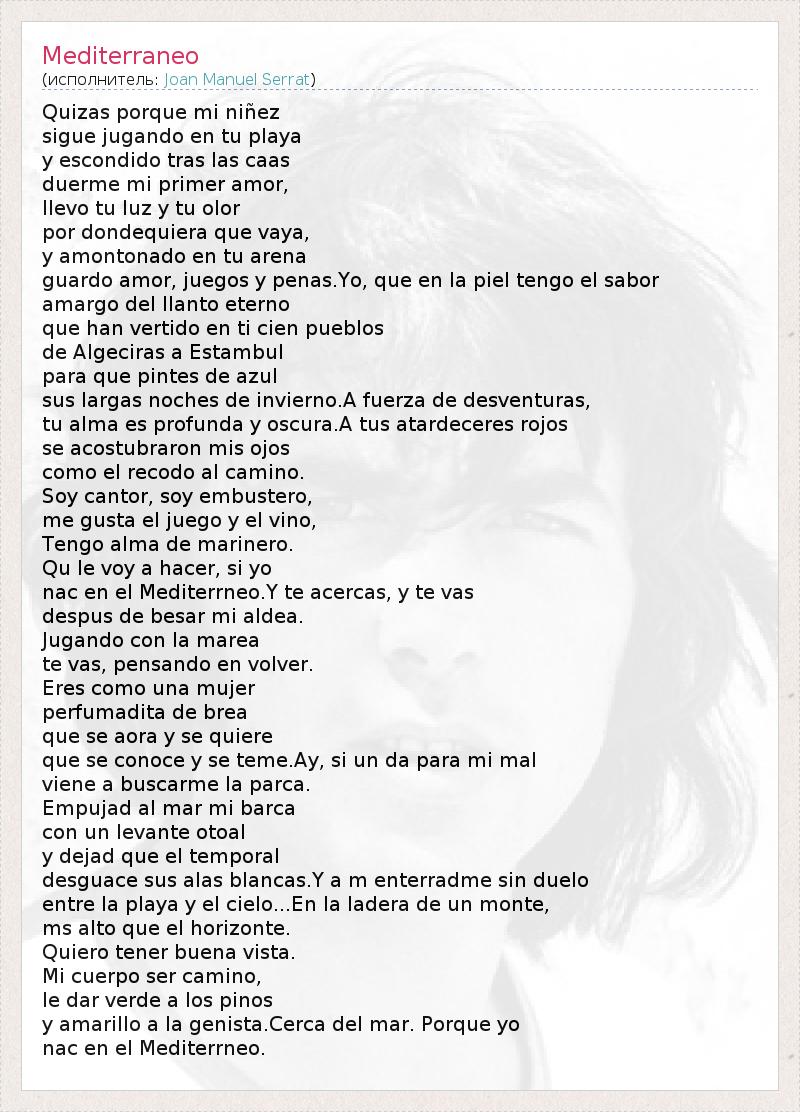 Quizas porque mi niñez sigue jugando en tu playa y escondido tras las caas duerme mi primer amor, llevo tu luz y tu olor por dondequiera que vaya, y amontonado en tu arena guardo amor, juegos y penas.Yo, que en la piel tengo el sabor amargo del llanto eterno que han vertido en ti cien pueblos de Algeciras a Estambul para que pintes de azul sus largas noches de invierno.A fuerza de desventuras, tu alma es profunda y oscura.A tus atardeceres rojos se acostubraron mis ojos como el recodo al camino. Soy cantor, soy embustero, me gusta el juego y el vino, Tengo alma de marinero. Qu le voy a hacer, si yo nac en el Mediterrneo.Y te acercas, y te vas despus de besar mi aldea. Jugando con la marea te vas, pensando en volver. Eres como una mujer perfumadita de brea que se aora y se quiere que se conoce y se teme.Ay, si un da para mi mal viene a buscarme la parca. Empujad al mar mi barca con un levante otoal y dejad que el temporal desguace sus alas blancas.Y a m enterradme sin duelo entre la playa y el cielo...En la ladera de un monte, ms alto que el horizonte. Quiero tener buena vista. Mi cuerpo ser camino, le dar verde a los pinos y amarillo a la genista.Cerca del mar. Porque yo nac en el Mediterrneo.