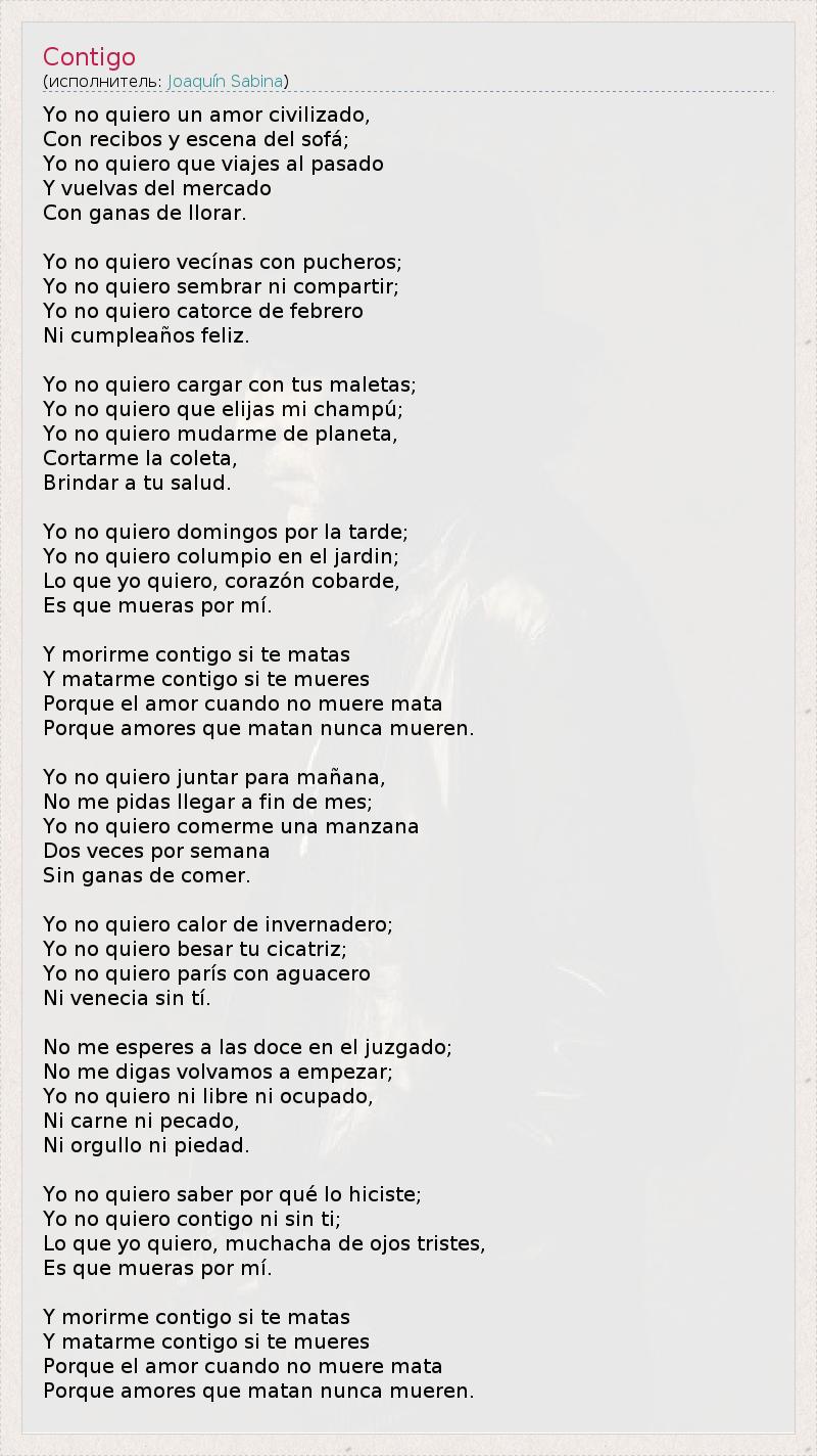 Это интересно:Хоаки́н Рамо́н Марти́нес Саби́на (исп. Joaquín Ramón Martínez Sabina, род. 12 февраля 1949, Убеда, Испания) — испанский рок-поэт, певец, композитор; один из столпов современной испаноязычной поп и рок-культуры. Автор-исполнитель, поставивший своё имя в один ряд с именами Боба Дилана, Жака Бреля, Сержа Генсбура или Бориса Гребенщикова, сходным образом оказавших влияние на культуру стран родного языка.Родился... продолжение