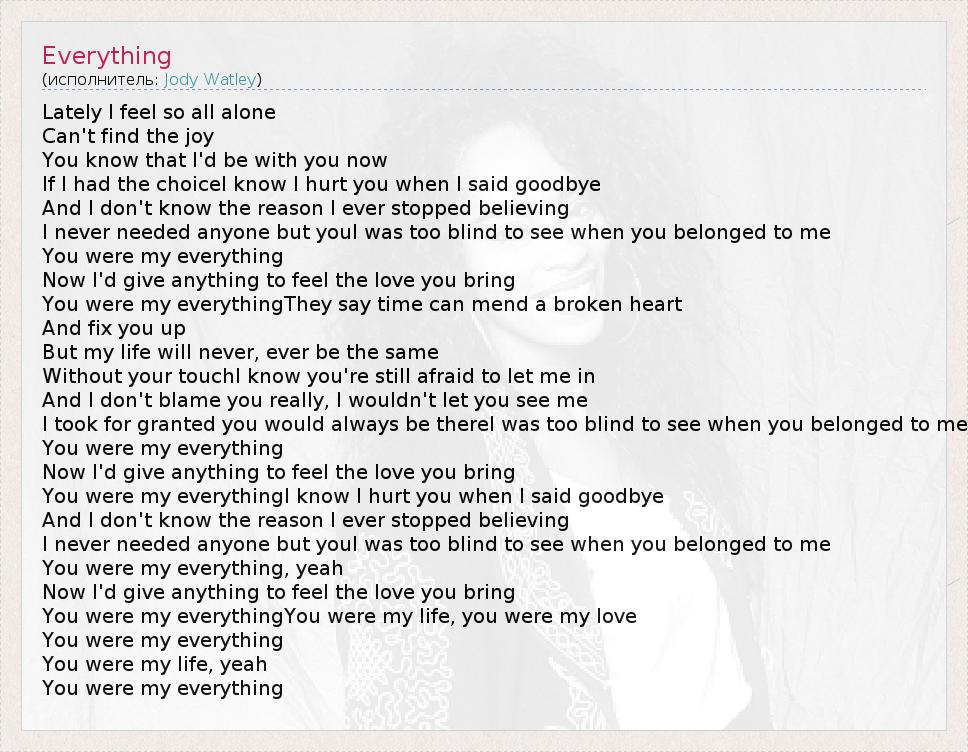 Lately I feel so all alone Can't find the joy You know that I'd be with you now If I had the choiceI know I hurt you when I said goodbye And I don't know the reason I ever stopped believing I never needed anyone but youI was too blind to see when you belonged to me You were my everything Now I'd give anything to feel the love you bring You were my everythingThey say time can mend a broken heart And fix you up But my life will never, ever be the same Without your touchI know you're still afraid to let me in And I don't blame you really, I wouldn't let you see me I took for granted you would always be thereI was too blind to see when you belonged to me You were my everything Now I'd give anything to feel the love you bring You were my everythingI know I hurt you when I said goodbye And I don't know the reason I ever stopped believing I never needed anyone but youI was too blind to see when you belonged to me You were my everything, yeah Now I'd give anything to feel the love you bring You were my everythingYou were my life, you were my love You were my everything You were my life, yeah You were my everything