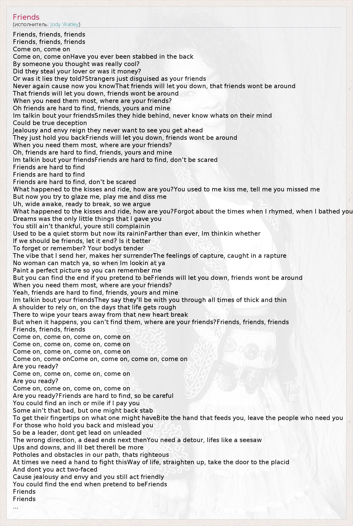 Friends, friends, friends Friends, friends, friends Come on, come on Come on, come onHave you ever been stabbed in the back By someone you thought was really cool? Did they steal your lover or was it money? Or was it lies they told?Strangers just disguised as your friends Never again cause now you knowThat friends will let you down, that friends wont be around That friends will let you down, friends wont be around When you need them most, where are your friends? Oh friends are hard to find, friends, yours and mine Im talkin bout your friendsSmiles they hide behind, never know whats on their mind Could be true deception Jealousy and envy reign they never want to see you get ahead They just hold you backFriends will let you down, friends wont be around When you need them most, where are your friends? Oh, friends are hard to find, friends, yours and mine Im talkin bout your friendsFriends are hard to find, don't be scared Friends are hard to find Friends are hard to find Friends are hard to find, don't be scared What happened to the kisses and ride, how are you?You used to me kiss me, tell me you missed me But now you try to glaze me, play me and diss me Uh, wide awake, ready to break, so we argue What happened to the kisses and ride, how are you?Forgot about the times when I rhymed, when I bathed you Dreams was the only little things that I gave you You still ain't thankful, youre still complainin Used to be a quiet storm but now its raininFarther than ever, Im thinkin whether If we should be friends, let it end? Is it better To forget or remember? Your bodys tender The vibe that I send her, makes her surrenderThe feelings of capture, caught in a rapture No woman can match ya, so when Im lookin at ya Paint a perfect picture so you can remember me But you can find the end if you pretend to beFriends will let you down, friends wont be around When you need them most, where are your friends? Yeah, friends are hard to find, friends, yours and mine Im talkin bout your friendsThey say they'll be with you through all times of thick and thin A shoulder to rely on, on the days that life gets rough There to wipe your tears away from that new heart break But when it happens, you can't find them, where are your friends?Friends, friends, friends Friends, friends, friends Come on, come on, come on, come on Come on, come on, come on, come on Come on, come on, come on, come on Come on, come onCome on, come on, come on, come on Are you ready? Come on, come on, come on, come on Are you ready? Come on, come on, come on, come on Are you ready?Friends are hard to find, so be careful You could find an inch or mile if I pay you Some ain't that bad, but one might back stab To get their fingertips on what one might haveBite the hand that feeds you, leave the people who need you For those who hold you back and mislead you So be a leader, dont get lead on unleaded The wrong direction, a dead ends next thenYou need a detour, lifes like a seesaw Ups and downs, and Ill bet therell be more Potholes and obstacles in our path, thats righteous At times we need a hand to fight thisWay of life, straighten up, take the door to the placid And dont you act two-faced Cause jealousy and envy and you still act friendly You could find the end when pretend to beFriends Friends Friends ...
