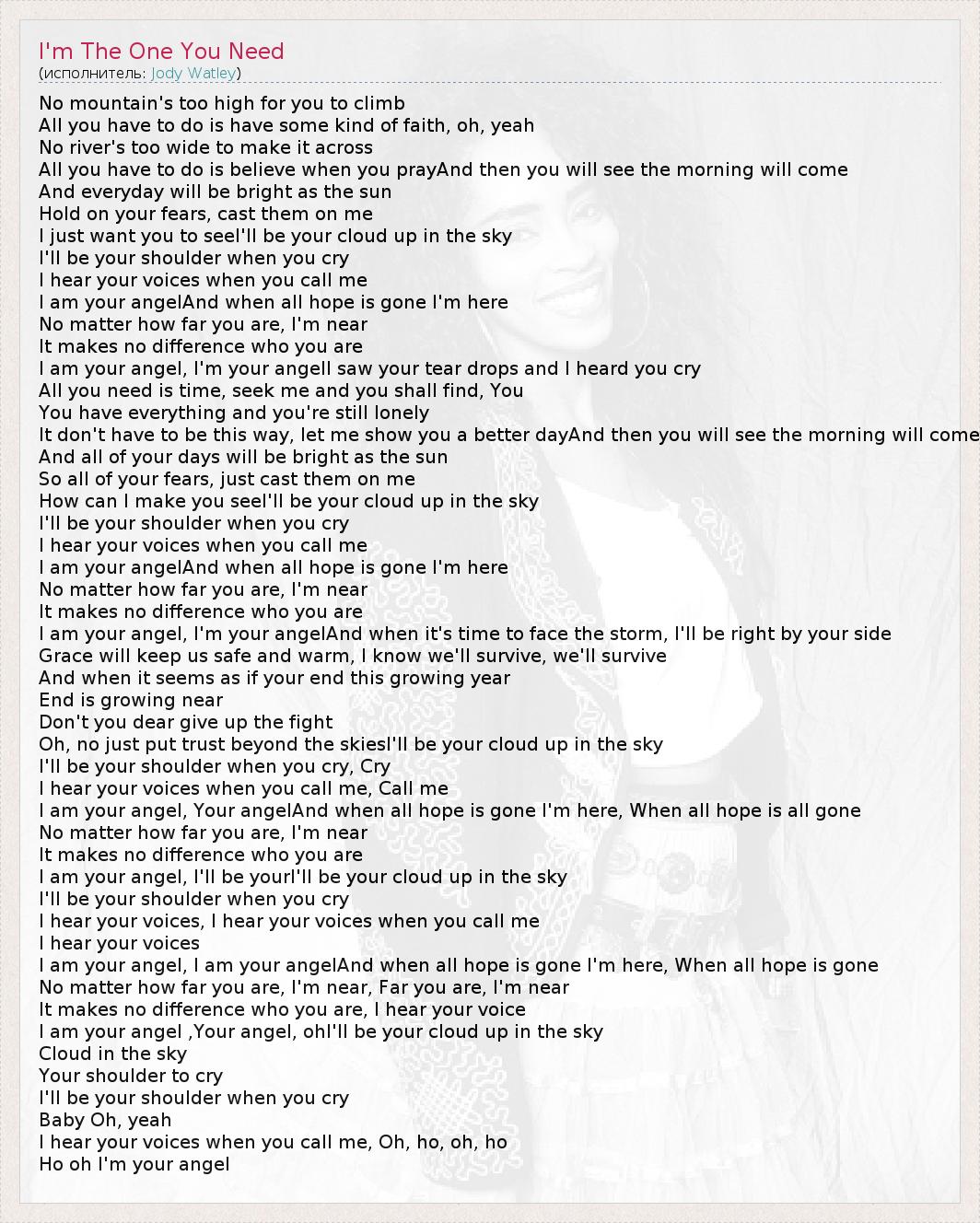 No mountain's too high for you to climb All you have to do is have some kind of faith, oh, yeah No river's too wide to make it across All you have to do is believe when you prayAnd then you will see the morning will come And everyday will be bright as the sun Hold on your fears, cast them on me I just want you to seeI'll be your cloud up in the sky I'll be your shoulder when you cry I hear your voices when you call me I am your angelAnd when all hope is gone I'm here No matter how far you are, I'm near It makes no difference who you are I am your angel, I'm your angelI saw your tear drops and I heard you cry All you need is time, seek me and you shall find, You You have everything and you're still lonely It don't have to be this way, let me show you a better dayAnd then you will see the morning will come And all of your days will be bright as the sun So all of your fears, just cast them on me How can I make you seeI'll be your cloud up in the sky I'll be your shoulder when you cry I hear your voices when you call me I am your angelAnd when all hope is gone I'm here No matter how far you are, I'm near It makes no difference who you are I am your angel, I'm your angelAnd when it's time to face the storm, I'll be right by your side Grace will keep us safe and warm, I know we'll survive, we'll survive And when it seems as if your end this growing year End is growing near Don't you dear give up the fight Oh, no just put trust beyond the skiesI'll be your cloud up in the sky I'll be your shoulder when you cry, Cry I hear your voices when you call me, Call me I am your angel, Your angelAnd when all hope is gone I'm here, When all hope is all gone No matter how far you are, I'm near It makes no difference who you are I am your angel, I'll be yourI'll be your cloud up in the sky I'll be your shoulder when you cry I hear your voices, I hear your voices when you call me I hear your voices I am your angel, I am your angelAnd when all hope is gone I'm here, When all hope is gone No matter how far you are, I'm near, Far you are, I'm near It makes no difference who you are, I hear your voice I am your angel ,Your angel, ohI'll be your cloud up in the sky Cloud in the sky Your shoulder to cry I'll be your shoulder when you cry Baby Oh, yeah I hear your voices when you call me, Oh, ho, oh, ho Ho oh I'm your angel