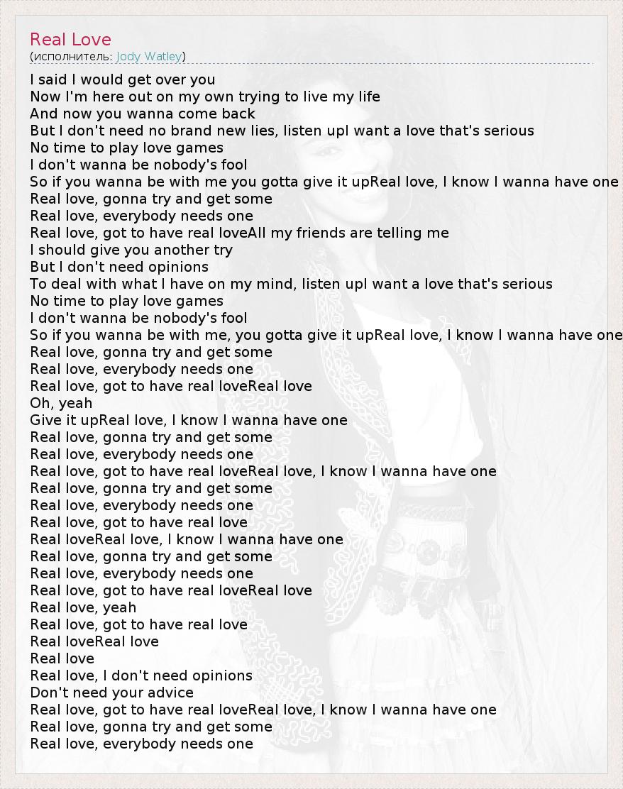 I said I would get over you Now I'm here out on my own trying to live my life And now you wanna come back But I don't need no brand new lies, listen upI want a love that's serious No time to play love games I don't wanna be nobody's fool So if you wanna be with me you gotta give it upReal love, I know I wanna have one Real love, gonna try and get some Real love, everybody needs one Real love, got to have real loveAll my friends are telling me I should give you another try But I don't need opinions To deal with what I have on my mind, listen upI want a love that's serious No time to play love games I don't wanna be nobody's fool So if you wanna be with me, you gotta give it upReal love, I know I wanna have one Real love, gonna try and get some Real love, everybody needs one Real love, got to have real loveReal love Oh, yeah Give it upReal love, I know I wanna have one Real love, gonna try and get some Real love, everybody needs one Real love, got to have real loveReal love, I know I wanna have one Real love, gonna try and get some Real love, everybody needs one Real love, got to have real love Real loveReal love, I know I wanna have one Real love, gonna try and get some Real love, everybody needs one Real love, got to have real loveReal love Real love, yeah Real love, got to have real love Real loveReal love Real love Real love, I don't need opinions Don't need your advice Real love, got to have real loveReal love, I know I wanna have one Real love, gonna try and get some Real love, everybody needs one