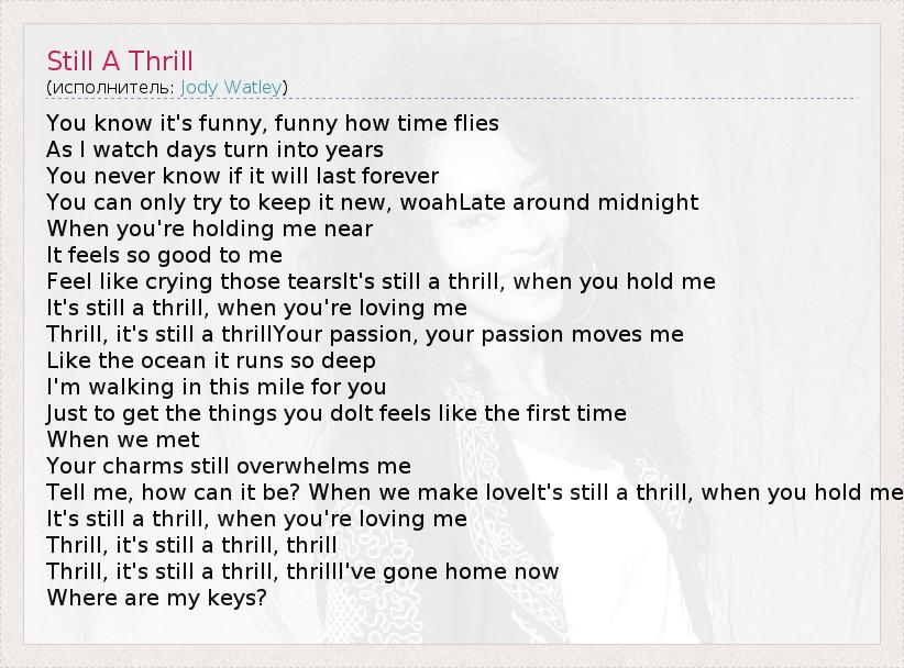 You know it's funny, funny how time flies As I watch days turn into years You never know if it will last forever You can only try to keep it new, woahLate around midnight When you're holding me near It feels so good to me Feel like crying those tearsIt's still a thrill, when you hold me It's still a thrill, when you're loving me Thrill, it's still a thrillYour passion, your passion moves me Like the ocean it runs so deep I'm walking in this mile for you Just to get the things you doIt feels like the first time When we met Your charms still overwhelms me Tell me, how can it be? When we make loveIt's still a thrill, when you hold me It's still a thrill, when you're loving me Thrill, it's still a thrill, thrill Thrill, it's still a thrill, thrillI've gone home now Where are my keys?