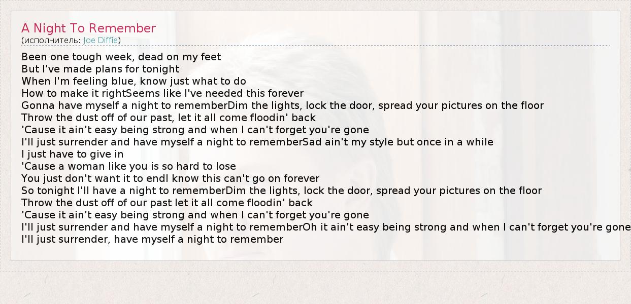 Been one tough week, dead on my feet But I've made plans for tonight When I'm feeling blue, know just what to do How to make it rightSeems like I've needed this forever Gonna have myself a night to rememberDim the lights, lock the door, spread your pictures on the floor Throw the dust off of our past, let it all come floodin' back 'Cause it ain't easy being strong and when I can't forget you're gone I'll just surrender and have myself a night to rememberSad ain't my style but once in a while I just have to give in 'Cause a woman like you is so hard to lose You just don't want it to endI know this can't go on forever So tonight I'll have a night to rememberDim the lights, lock the door, spread your pictures on the floor Throw the dust off of our past let it all come floodin' back 'Cause it ain't easy being strong and when I can't forget you're gone I'll just surrender and have myself a night to rememberOh it ain't easy being strong and when I can't forget you're gone I'll just surrender, have myself a night to remember