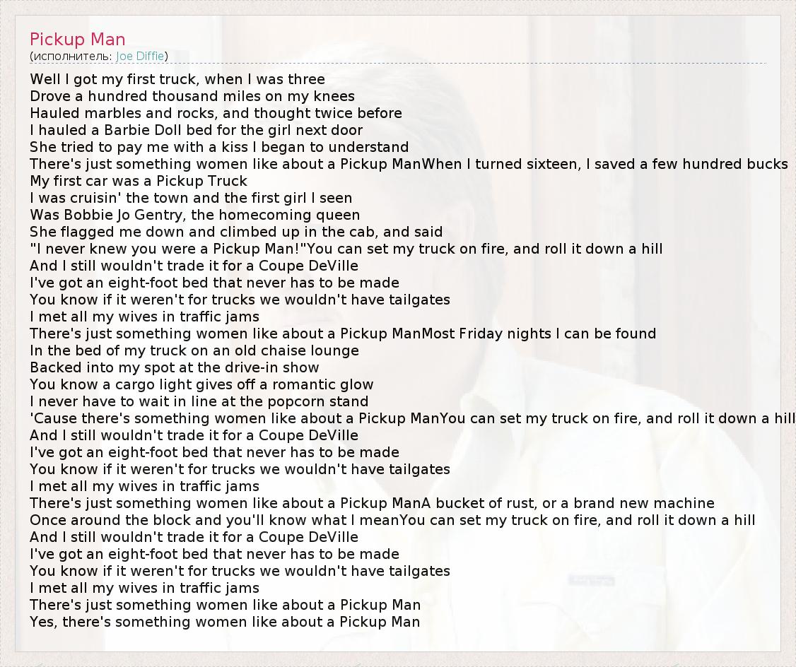 Well I got my first truck, when I was three Drove a hundred thousand miles on my knees Hauled marbles and rocks, and thought twice before I hauled a Barbie Doll bed for the girl next door She tried to pay me with a kiss I began to understand There's just something women like about a Pickup ManWhen I turned sixteen, I saved a few hundred bucks My first car was a Pickup Truck I was cruisin' the town and the first girl I seen Was Bobbie Jo Gentry, the homecoming queen She flagged me down and climbed up in the cab, and said "I never knew you were a Pickup Man!"You can set my truck on fire, and roll it down a hill And I still wouldn't trade it for a Coupe DeVille I've got an eight-foot bed that never has to be made You know if it weren't for trucks we wouldn't have tailgates I met all my wives in traffic jams There's just something women like about a Pickup ManMost Friday nights I can be found In the bed of my truck on an old chaise lounge Backed into my spot at the drive-in show You know a cargo light gives off a romantic glow I never have to wait in line at the popcorn stand 'Cause there's something women like about a Pickup ManYou can set my truck on fire, and roll it down a hill And I still wouldn't trade it for a Coupe DeVille I've got an eight-foot bed that never has to be made You know if it weren't for trucks we wouldn't have tailgates I met all my wives in traffic jams There's just something women like about a Pickup ManA bucket of rust, or a brand new machine Once around the block and you'll know what I meanYou can set my truck on fire, and roll it down a hill And I still wouldn't trade it for a Coupe DeVille I've got an eight-foot bed that never has to be made You know if it weren't for trucks we wouldn't have tailgates I met all my wives in traffic jams There's just something women like about a Pickup Man Yes, there's something women like about a Pickup Man