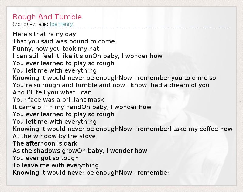 Here's that rainy day That you said was bound to come Funny, now you took my hat I can still feel it like it's onOh baby, I wonder how You ever learned to play so rough You left me with everything Knowing it would never be enoughNow I remember you told me so You're so rough and tumble and now I knowI had a dream of you And I'll tell you what I can Your face was a brilliant mask It came off in my handOh baby, I wonder how You ever learned to play so rough You left me with everything Knowing it would never be enoughNow I rememberI take my coffee now At the window by the stove The afternoon is dark As the shadows growOh baby, I wonder how You ever got so tough To leave me with everything Knowing it would never be enoughNow I remember