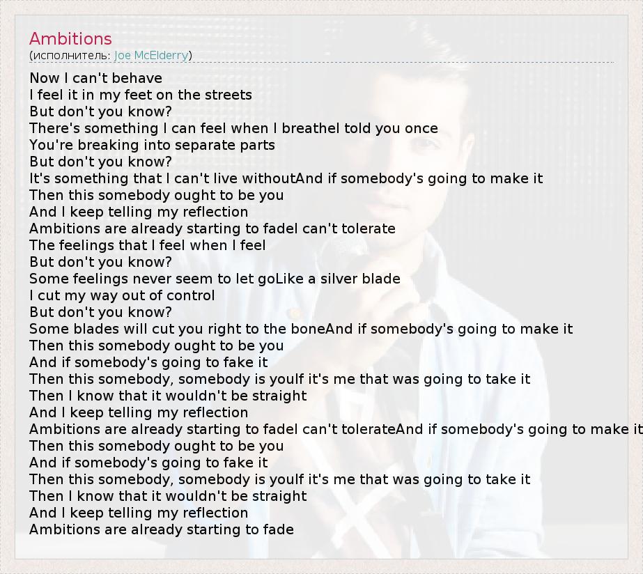 Now I can't behave I feel it in my feet on the streets But don't you know? There's something I can feel when I breatheI told you once You're breaking into separate parts But don't you know? It's something that I can't live withoutAnd if somebody's going to make it Then this somebody ought to be you And I keep telling my reflection Ambitions are already starting to fadeI can't tolerate The feelings that I feel when I feel But don't you know? Some feelings never seem to let goLike a silver blade I cut my way out of control But don't you know? Some blades will cut you right to the boneAnd if somebody's going to make it Then this somebody ought to be you And if somebody's going to fake it Then this somebody, somebody is youIf it's me that was going to take it Then I know that it wouldn't be straight And I keep telling my reflection Ambitions are already starting to fadeI can't tolerateAnd if somebody's going to make it Then this somebody ought to be you And if somebody's going to fake it Then this somebody, somebody is youIf it's me that was going to take it Then I know that it wouldn't be straight And I keep telling my reflection Ambitions are already starting to fade