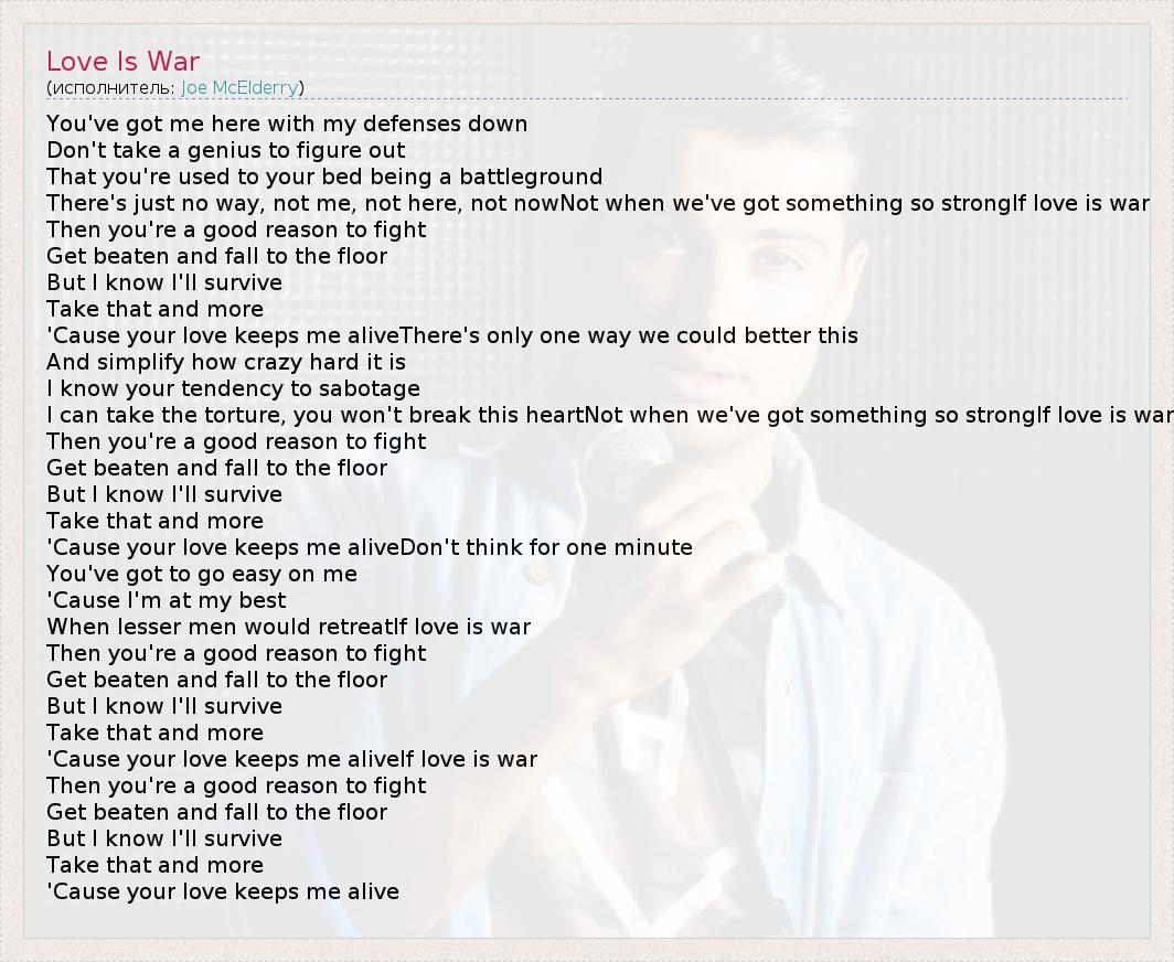 You've got me here with my defenses down Don't take a genius to figure out That you're used to your bed being a battleground There's just no way, not me, not here, not nowNot when we've got something so strongIf love is war Then you're a good reason to fight Get beaten and fall to the floor But I know I'll survive Take that and more 'Cause your love keeps me aliveThere's only one way we could better this And simplify how crazy hard it is I know your tendency to sabotage I can take the torture, you won't break this heartNot when we've got something so strongIf love is war Then you're a good reason to fight Get beaten and fall to the floor But I know I'll survive Take that and more 'Cause your love keeps me aliveDon't think for one minute You've got to go easy on me 'Cause I'm at my best When lesser men would retreatIf love is war Then you're a good reason to fight Get beaten and fall to the floor But I know I'll survive Take that and more 'Cause your love keeps me aliveIf love is war Then you're a good reason to fight Get beaten and fall to the floor But I know I'll survive Take that and more 'Cause your love keeps me alive